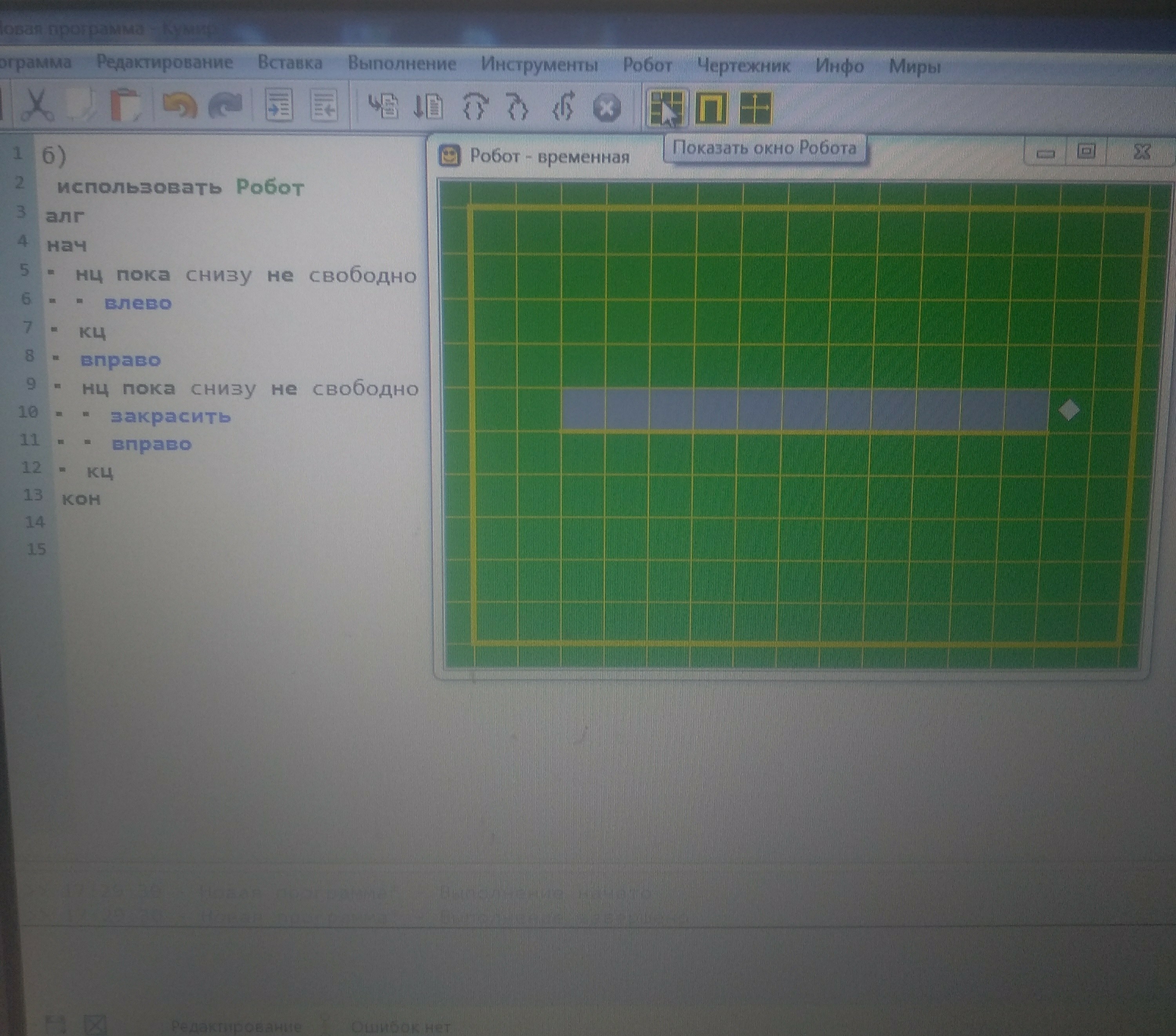горизонтально. Робот находится в одной из клеток, прилегающих к стене сверху (рис.).