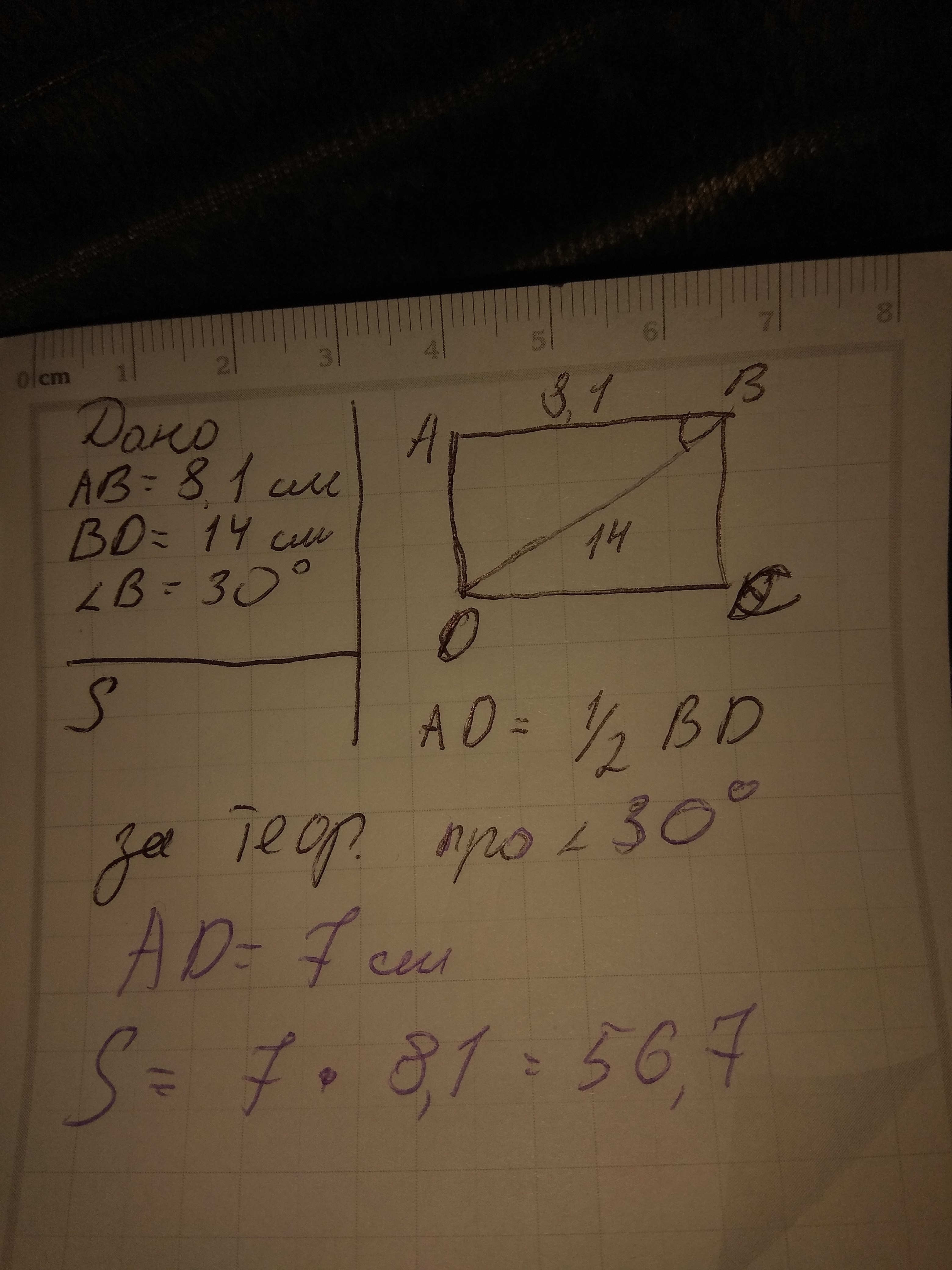 определите площадь параллелограмма со стороной 8,1 см и диагональю равной 14 см,и образующей с этой стороной угол в 30 градусов
