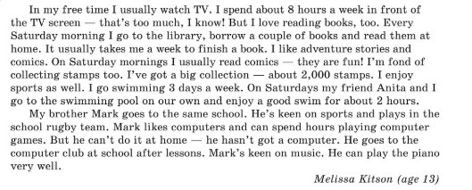 в свободное время я обычно смотрю телевизор. Я провожу около 8-ми часов в неделю у телевизора - это очень много, я знаю! Но я также люблю читать книги! каждое воскресное утро я хожу в библиотеку, беру пару книг и читаю их дома. Обычно у меня уходит неделя, чтобы прочитать книгу. Мне нравятся приключенческие истории и комиксы. В воскресенье я обычно читаю комиксы, они веселые! Также я увлекаюсь коллекционированием марок. У меня есть большая коллекция, около 2000 марок. Также мне нравится спорт. Я хожу на плавание 3 раза в неделю. По воскресеньям я с моей подругой Анитой ходим в бассейн самостоятельно и нам нравиться плавать там около 2-ух часов.