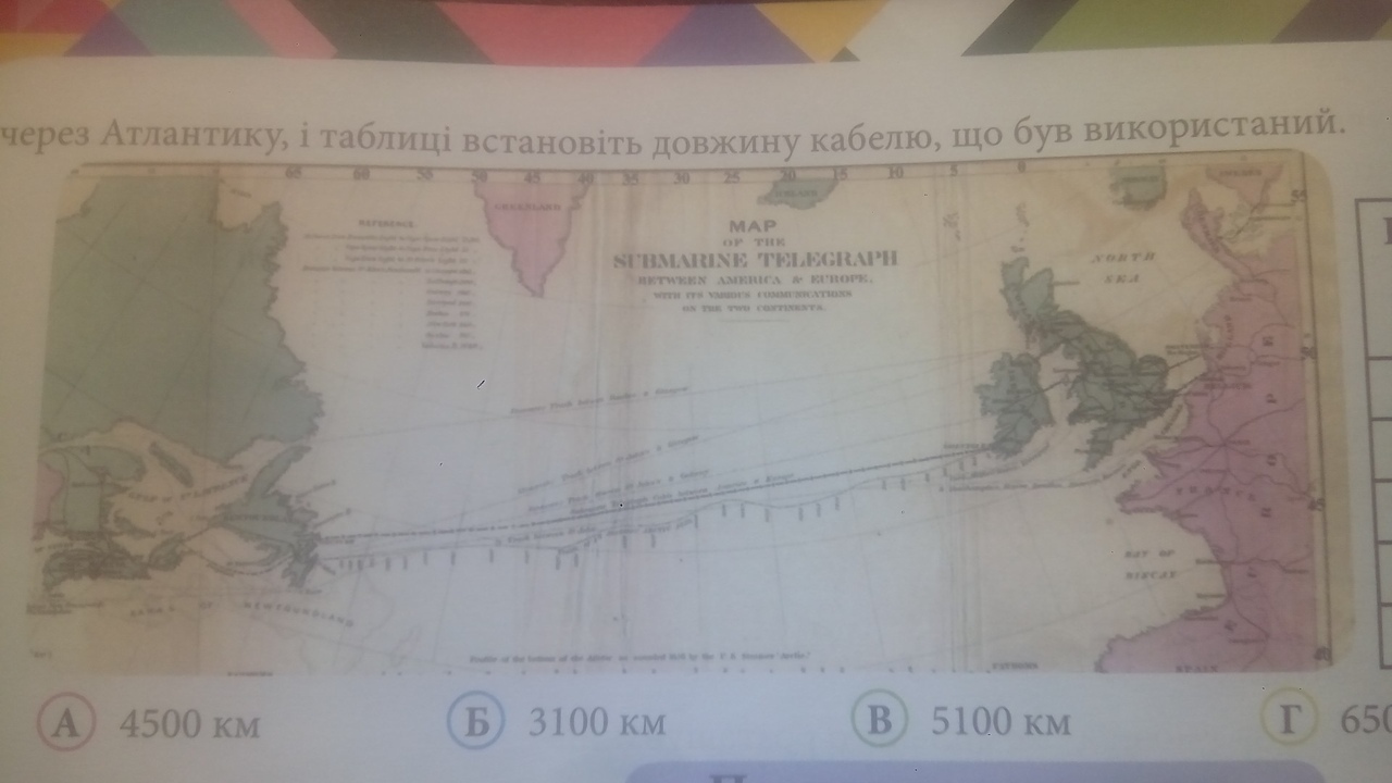 В 1856 году было основано акционерное общество "Atlantic Telegraf Company", которое в 1857 году приступило к прокладке аромовного телеграфного кабеля через Атлантический океан 5 августа 1858 года, выполнив успешное прокладки, корабли "Агамемон" и "Нігагара" достигли своих пунктов назначения - острова Валентия и Ньюфаундленд, в результате чего была установлена первая трансатлантическая телеграфная линия, соединившая Старый и Новый свет. С помощью картосхемы, на которой изображен маршрут прокладки телеграфного каблей через Атлантику, и таблицивостановите длину используемого кабеля