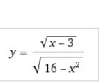 y=frac{sqrt{x-3}}{sqrt{16-x^2}}\\OOF:; ; left { {{x-3geq 0} atop {16-x^2>0}} right. ; ; left { {{xgeq 3} atop {(4-x)(4+x)>0}} right. ; left { {{xgeq 3} atop {xin (-4,4)}} right. ; Rightarrow ; ; boxed {xin [, 3,4)}\\znaki; (4-x)(4+x):; ; ; ---(-4)+++(4)---
