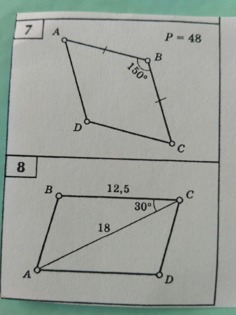 AB=BC отсюда следует и все стороны равны, потому что противоположные: BC=AD=AB=CD=48:4=12 4 стороны и делим 48 на 4. Затем проводим из угла B высоту, а угол A=30 градусам, ибо односторонние при параллельных прямых и секущей углы дают 180 градусов (180-150=30). Высоту найдешь через угол 30 градусов, против угла в 30 градусов лежит катет, который равен половине гипотенузы, это BH, т.e. высота (12:2=6) Затем берешь и умножаешь основание (AD) и высоту, проведенную к этому основанию (BH) 12*6=72.