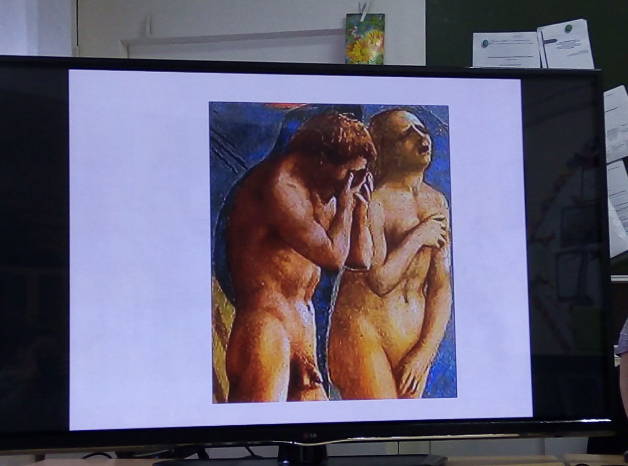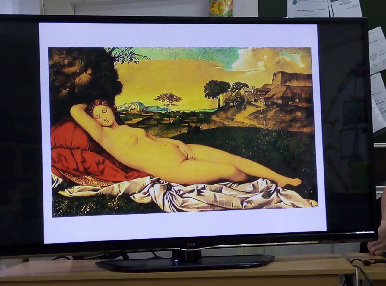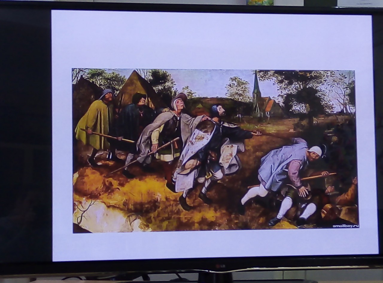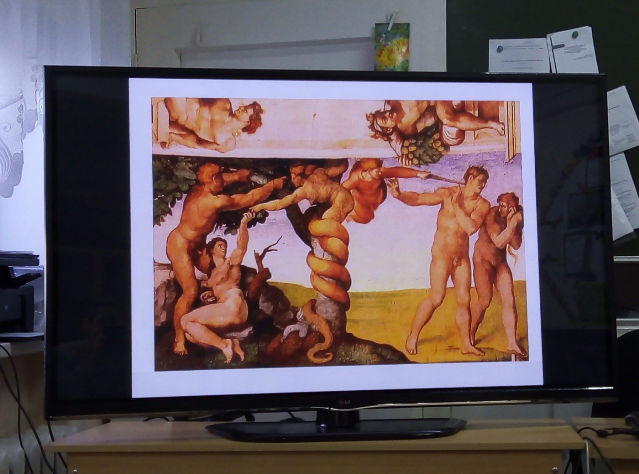 Микеланджело Буонарроти - грехопадие адама и евы, изгнагнание из рая. Скульптор Донателло - статуя давида, Питер Брейгель - слепые, Джорджо Барбарелли - спящая венера караваджо.