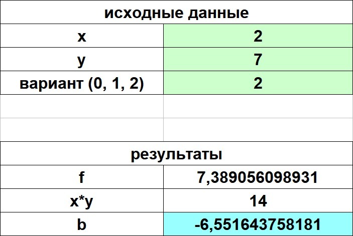 В таблице вычисляется значение b так же как и в программе. А также вычисляется f и значение x*y (чтобы было понятнее, по какой формуле считала программа). Чтобы формулы нормально читались, я задал имена ячейкам с исходными данными и результатами такие же, как и имена переменных в программе.