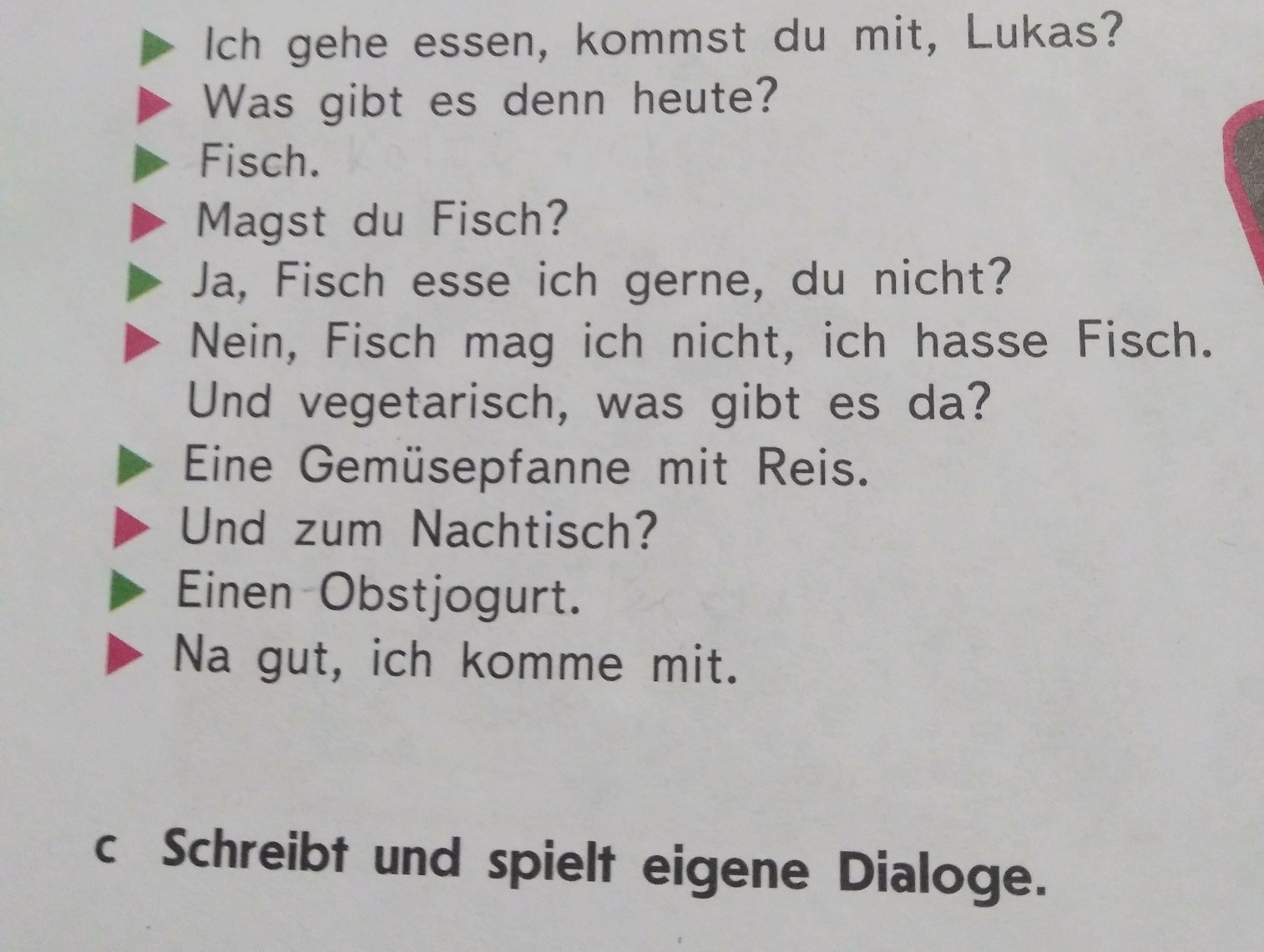A.: Nein Fleisch mag ich nicht. Ich hasse Fleisch. Ich esse vegitarisch. Was gibt es da?