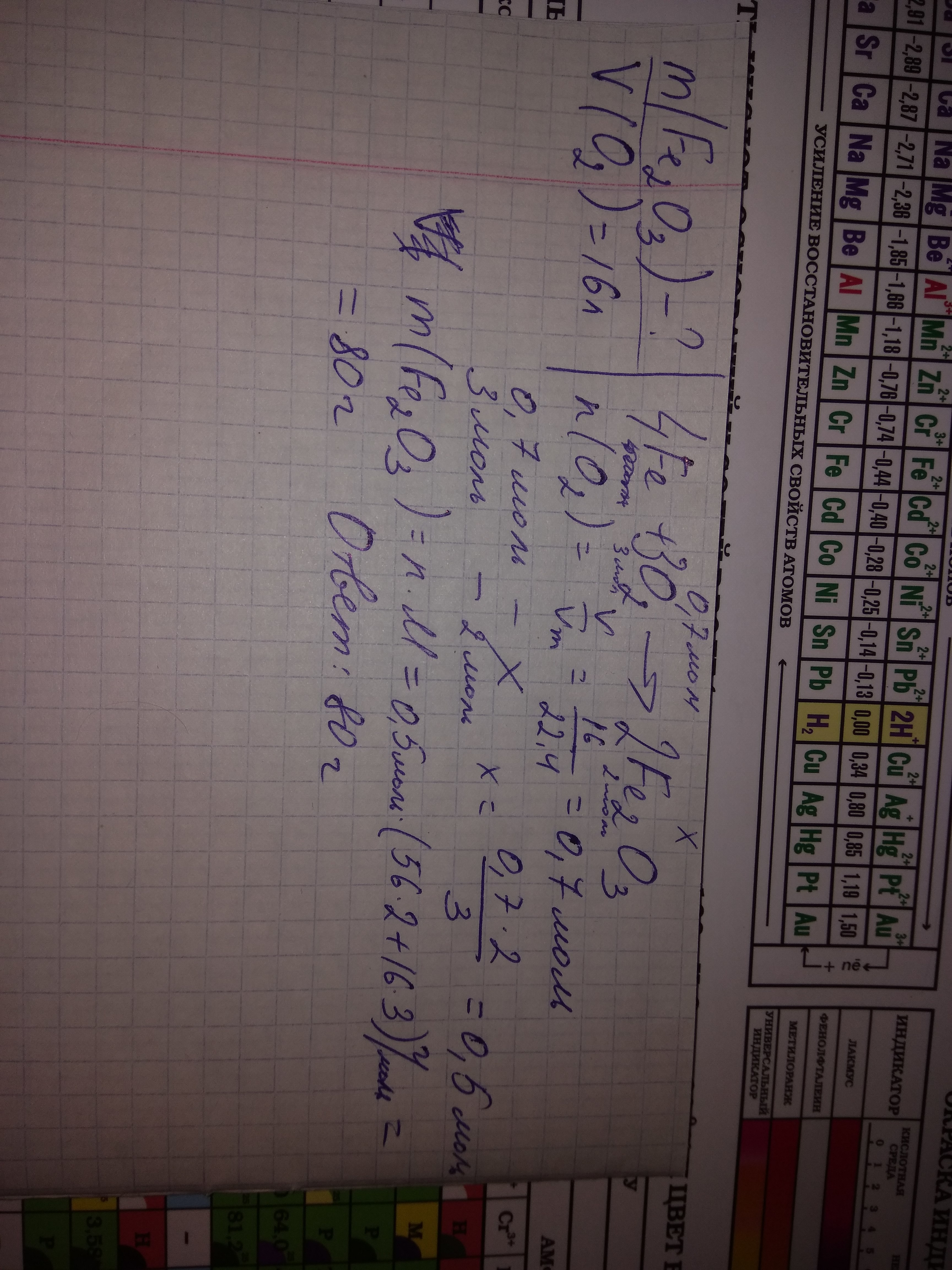 Какая масса оксида железа 3 образуется при окислении железа на воздухе если на эту реакцию ушло 16 л кислорода