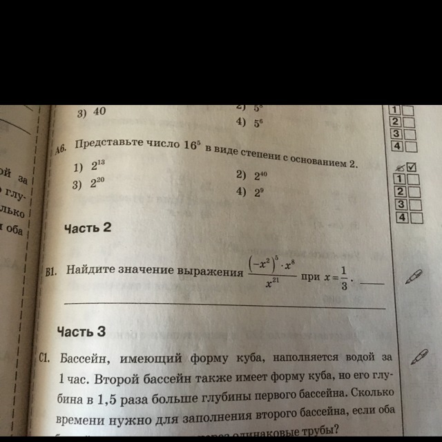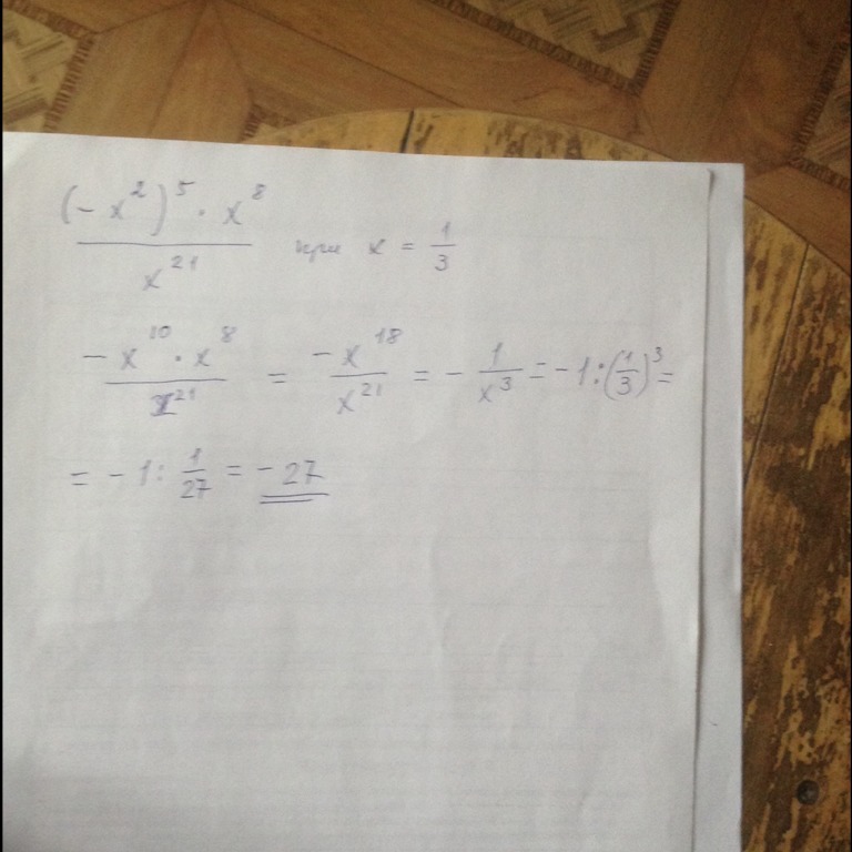 (-x^2)^5*x^8 / x^21= -x^10*x^8 / x^21= -x^18 / x^21= -1/x^3. подставляем значение: (-1): (1/3)^3=(-1):1/27= -27. Ответ: -27.