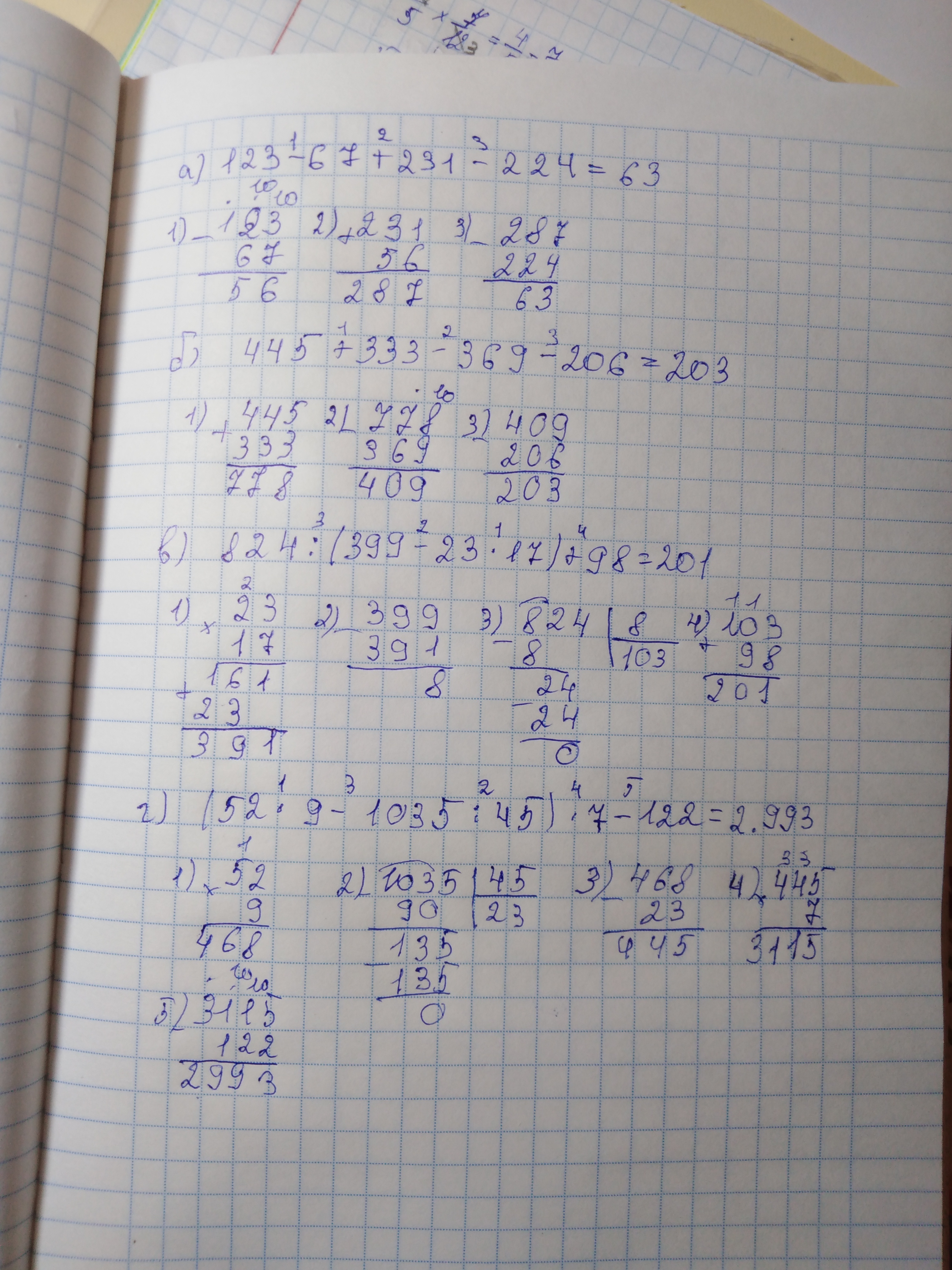 а)123-67+231-224; б)445+333-369-206 в)824:(399-23•17)+98; г)(52•9-1035:45)•7-122; определите порядок выполнения действий и найдите значение выражения