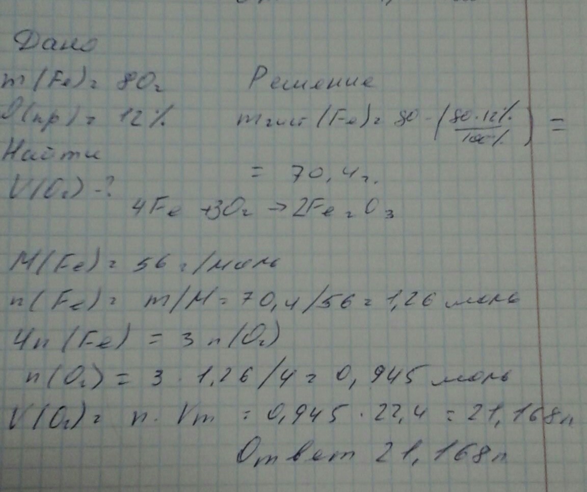 Какой объем O2 вступит в реакцию с железом массой 80 г , содержащего 12 % примесей . Помогите Пж !!!!!