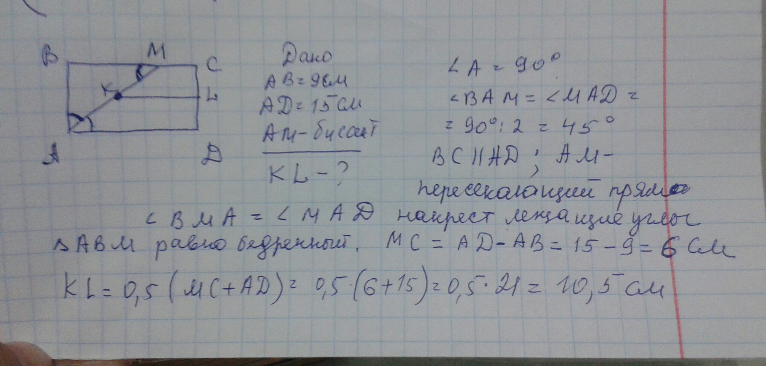В прямоугольнике ABCD AB=9см, AD=15см, AM-бессектриса угла А (М принадлежит стороне ВС). Определитель среднюю линию ю трапеции АМСD