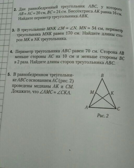 5. Так как треугольник равнобедренный и АК и СМ это медианы, то АМ+МВ+ВК+КС, так же угол КСА=углу МАС