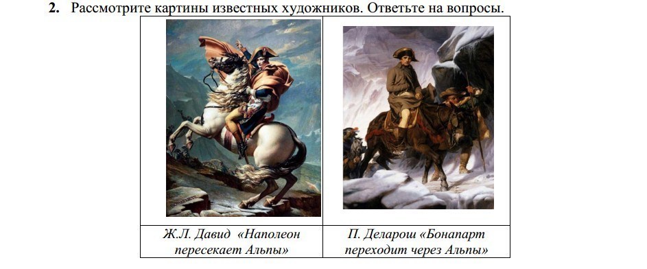 Скорее всего, более приближена к истории вторая картина Делароша «Бонапарт переходит через Альпы». На этой картине Наполеон едет на осле, уставший, грязный, обессиленный – это реальнее, ведь человек переходил горы.