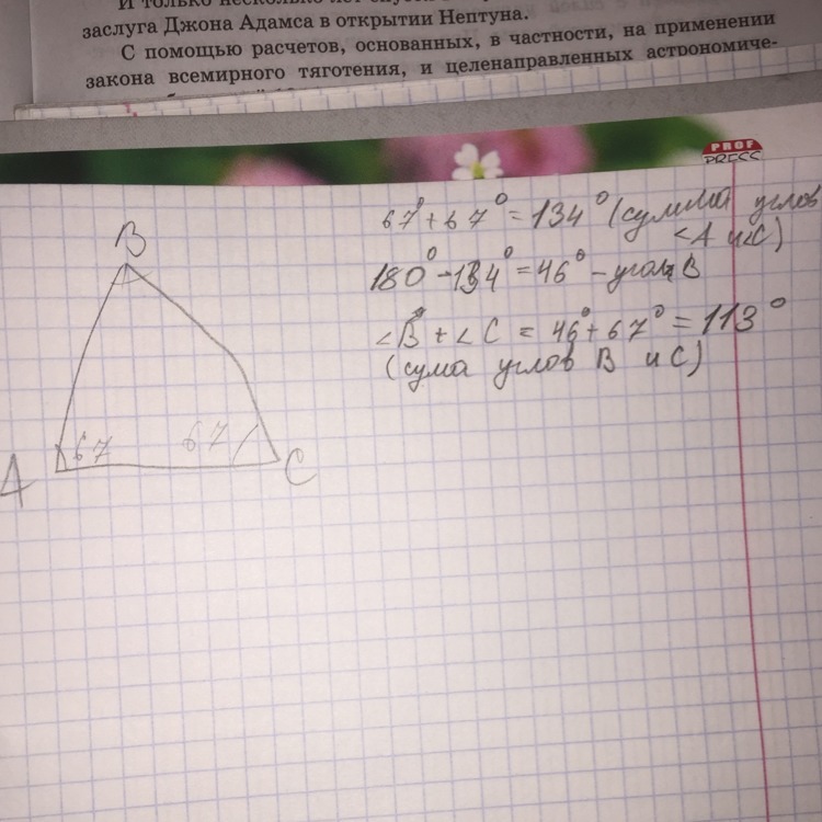 В равнобедренном треугольнике ABC с основанием AC угол A равен углу С (свойство равнобедренного треугольника) и оба равны по 67° (дано). => Сумма углов А и С равна 2*67 = 134°. Это ответ.