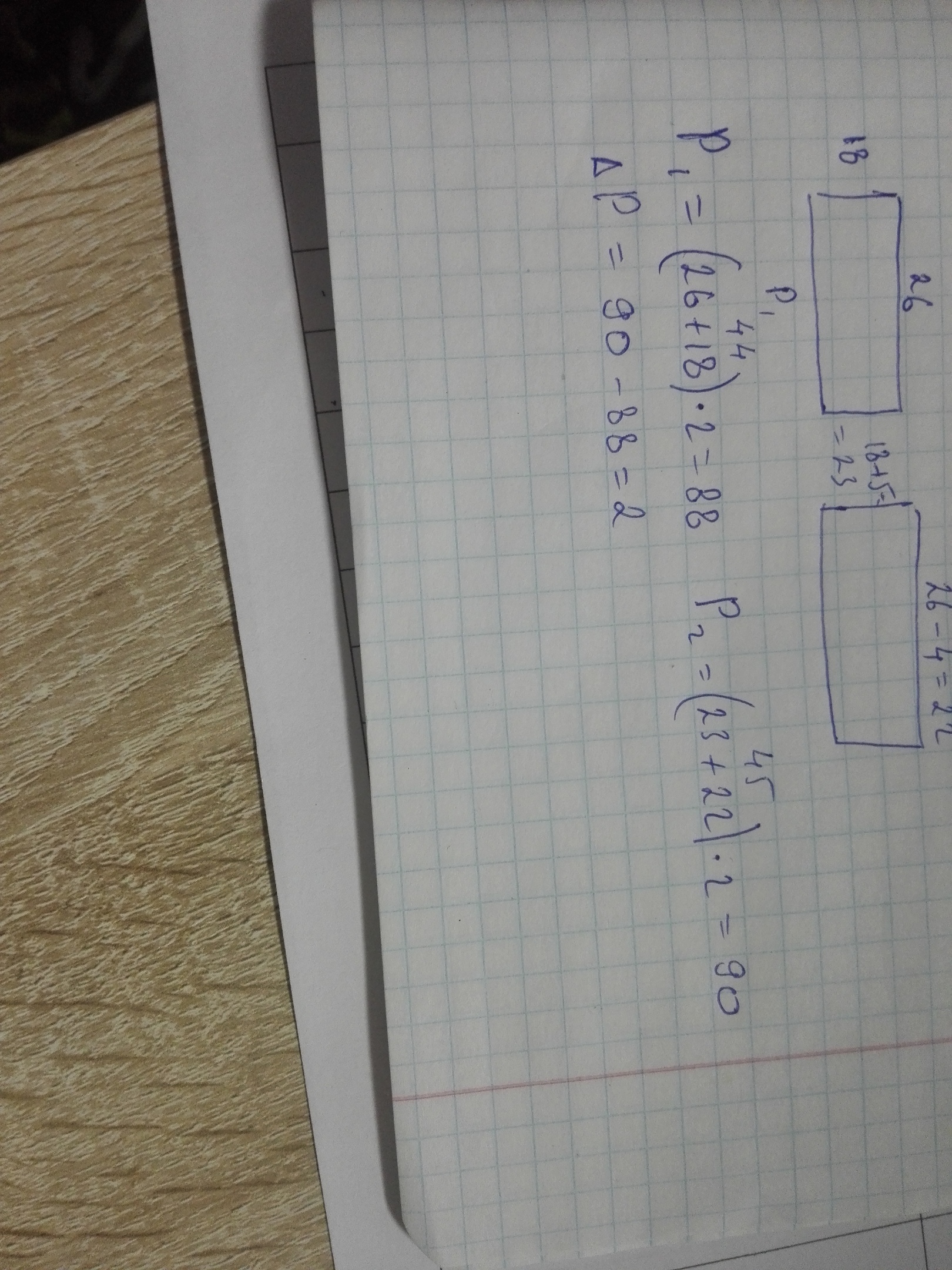 стороны прямоугольника равны 18 и 26 см. найдите приращение его периметра если меньшую стороны увеличить ра 5 см а большую уменьшить на 4 см