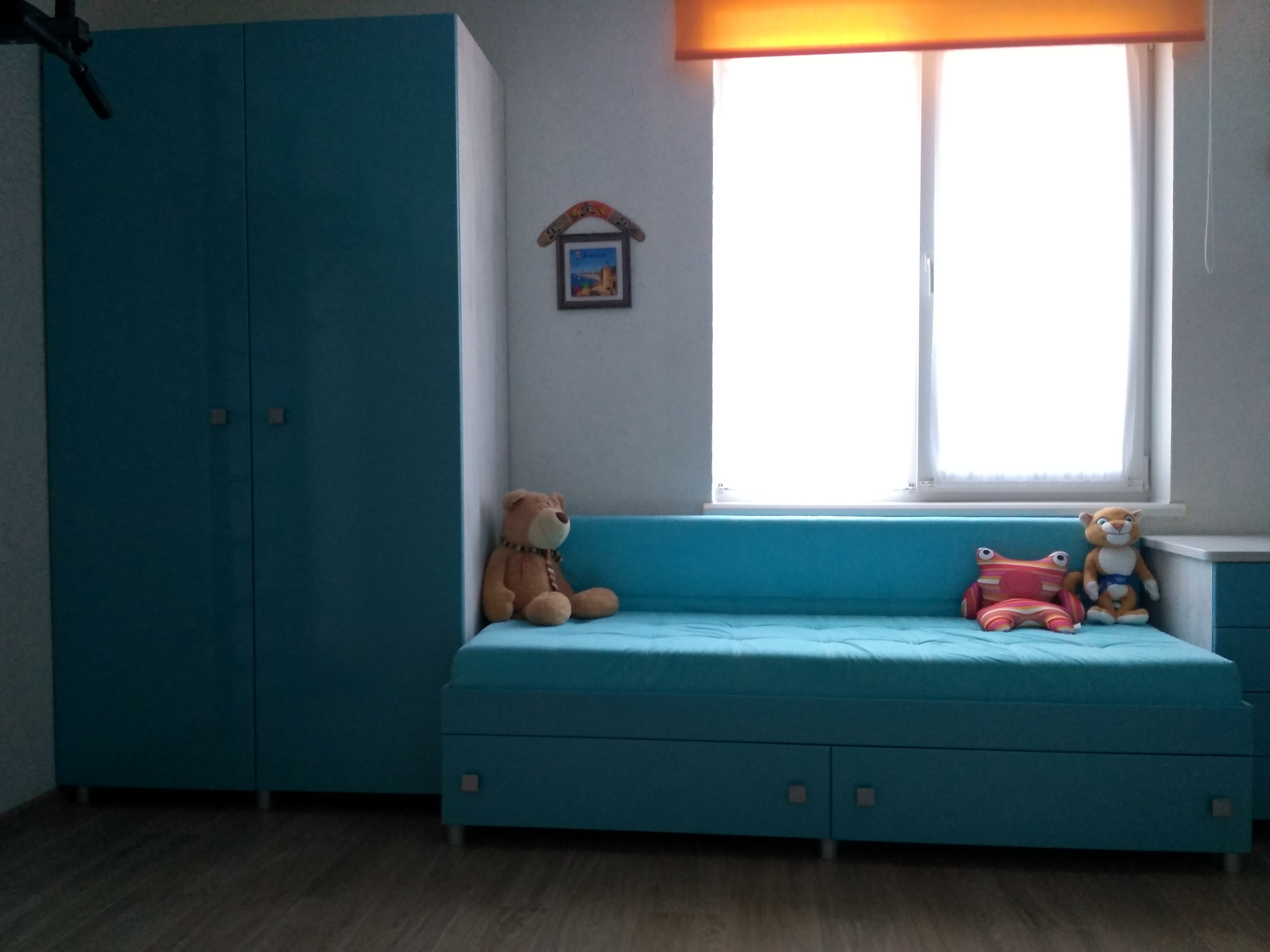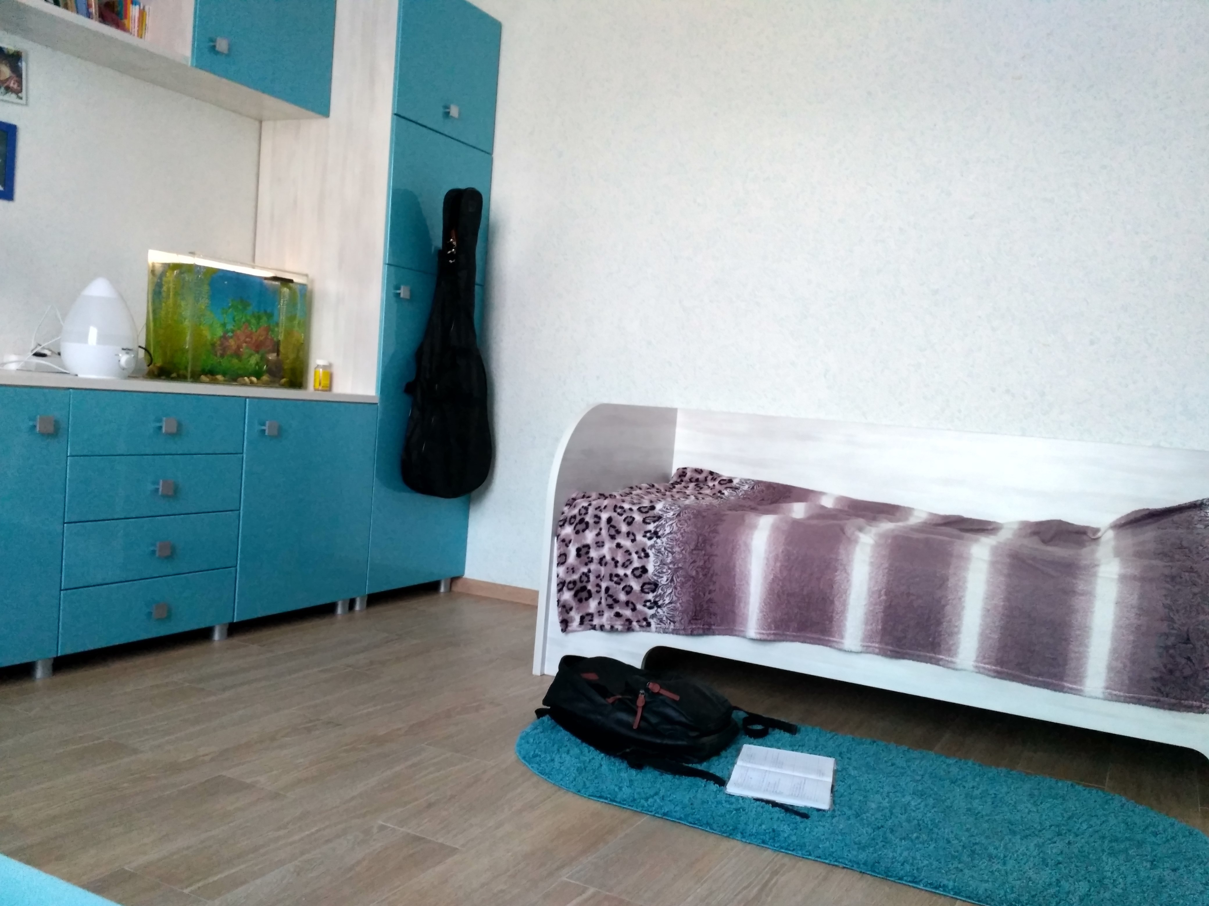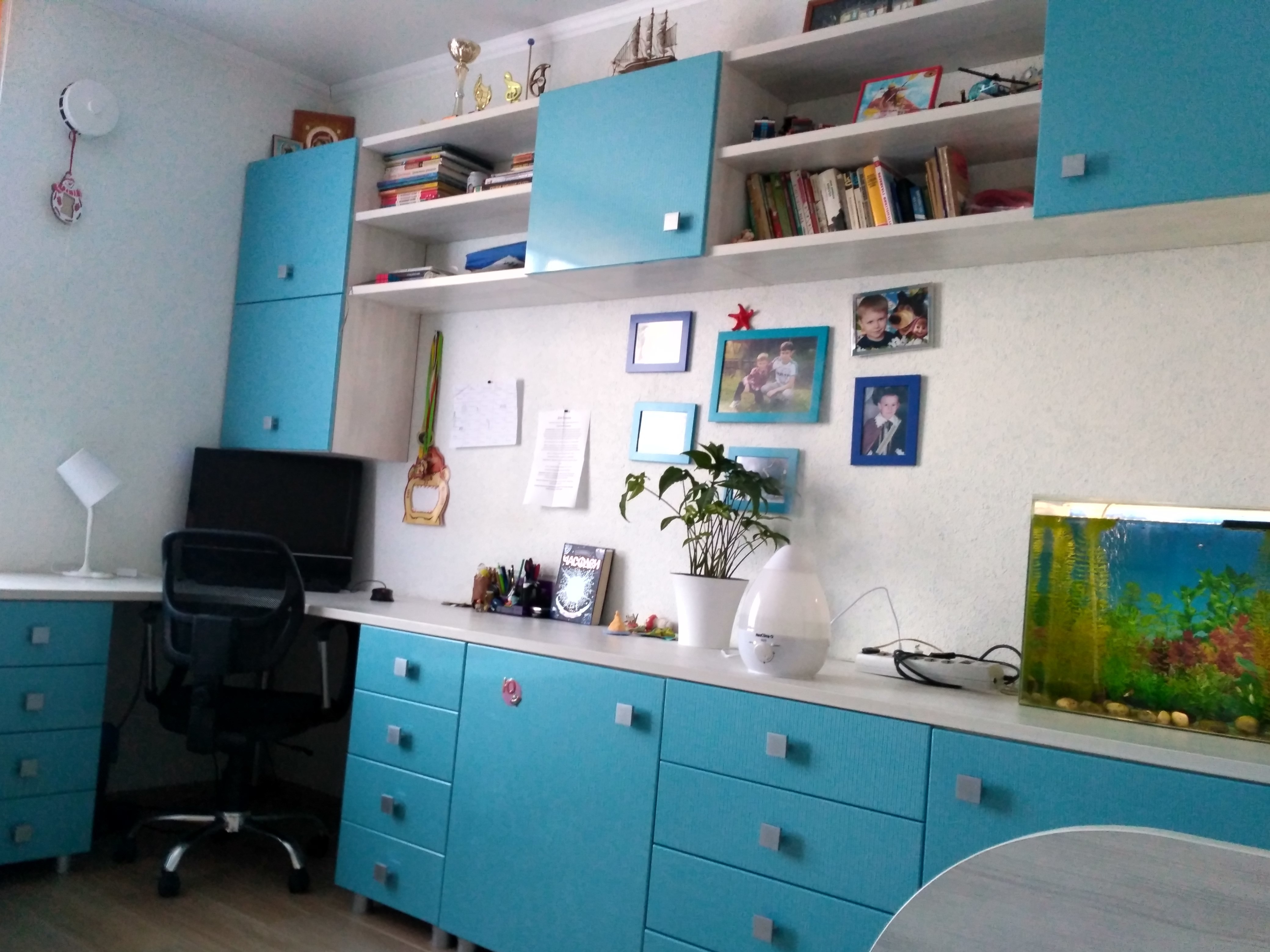 The room has a large table at one end of which is a computer, and at the other is an aquarium. Above the table weighs many boxes. Opposite the computer is a sofa, opposite the sofa bed. Next to the sofa is a wardrobe with clothes.