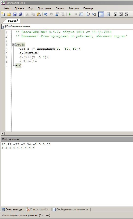 Составьте программу которая формирует массив из 9 случайных чисел и заменят все элементы массива единицами.