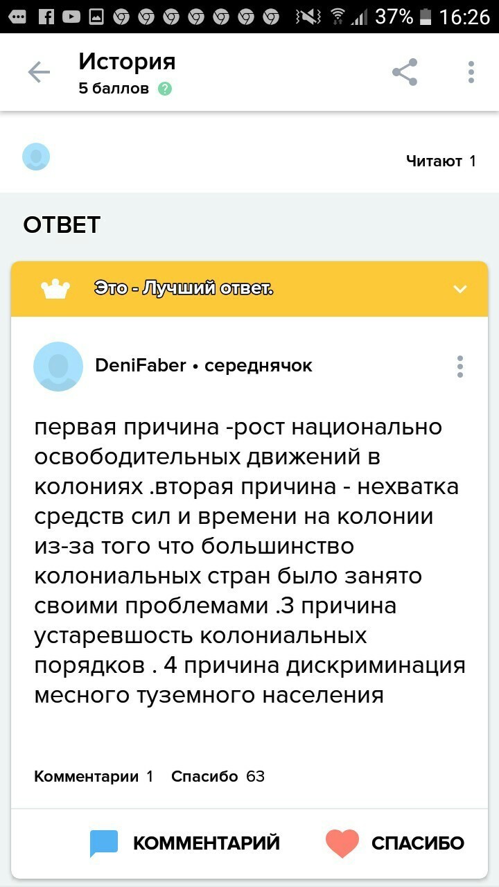 Первая причина -рост национально освободительных движений в колониях .вторая причина - нехватка средств сил и времени на колонии из-за того что большинство колониальных стран было занято своими проблемами .3 причина устаревшость колониальных порядков . 4 причина дискриминация месного туземного населения