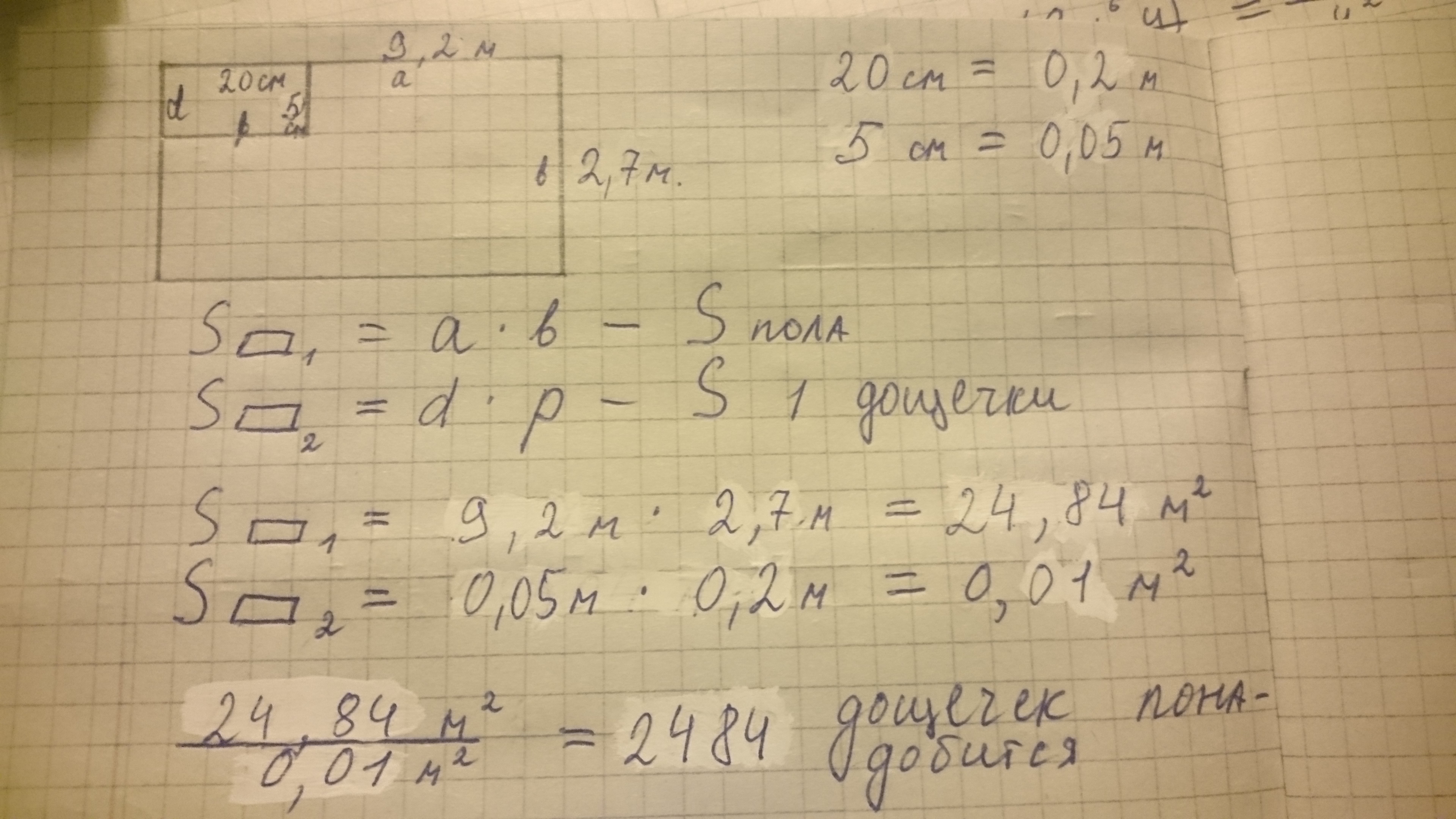 Пол комнаты, который имеет форму прямоугольника со сторонами 9,2 м и 2,7 м, необходимо покрыть паркетом прямоугольной формы. Длина дощечки паркета равна 20 см, а ширина — 5 см.