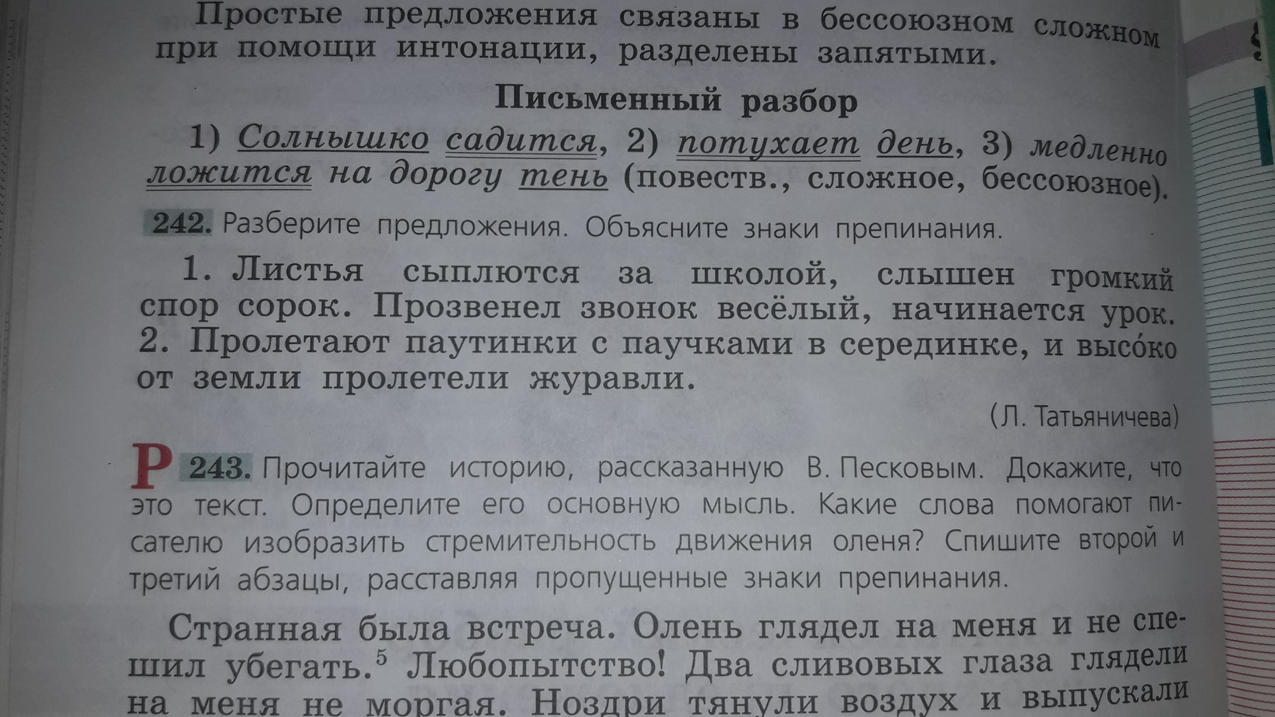 242. 1. 1)Листья(подлежащее) сыплются(сказуемое) за школой, 2)слышен(сказуемое) громкий спор(подлежащее) сорок.(Повест., сложное, бессоюзное). 1)Прозвенел(сказуемое) звонок(подлежащее) весёлый, 2)начинается(сказуемое) урок(подлежащее).(Повест., сложное, бессоюзное) 2. 1)Пролетают(сказуемое) паутинки с паучками(подлежащее) в серединке, и(союз) 2)высоко от земли пролетают(сказуемое) журавли(подлежащее).(Повест., сложное, союзное (сложносочинённое)).
