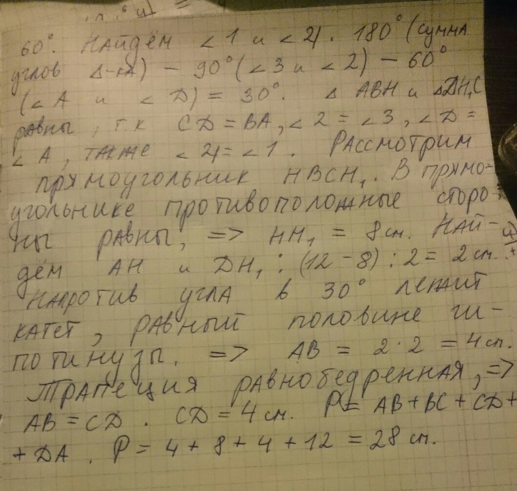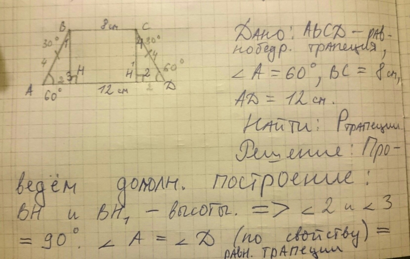 в равнобедренной трапеции ABCD основания AD=12,BC=8см, угол A=60градусов.Найдите периметр трапеции.
