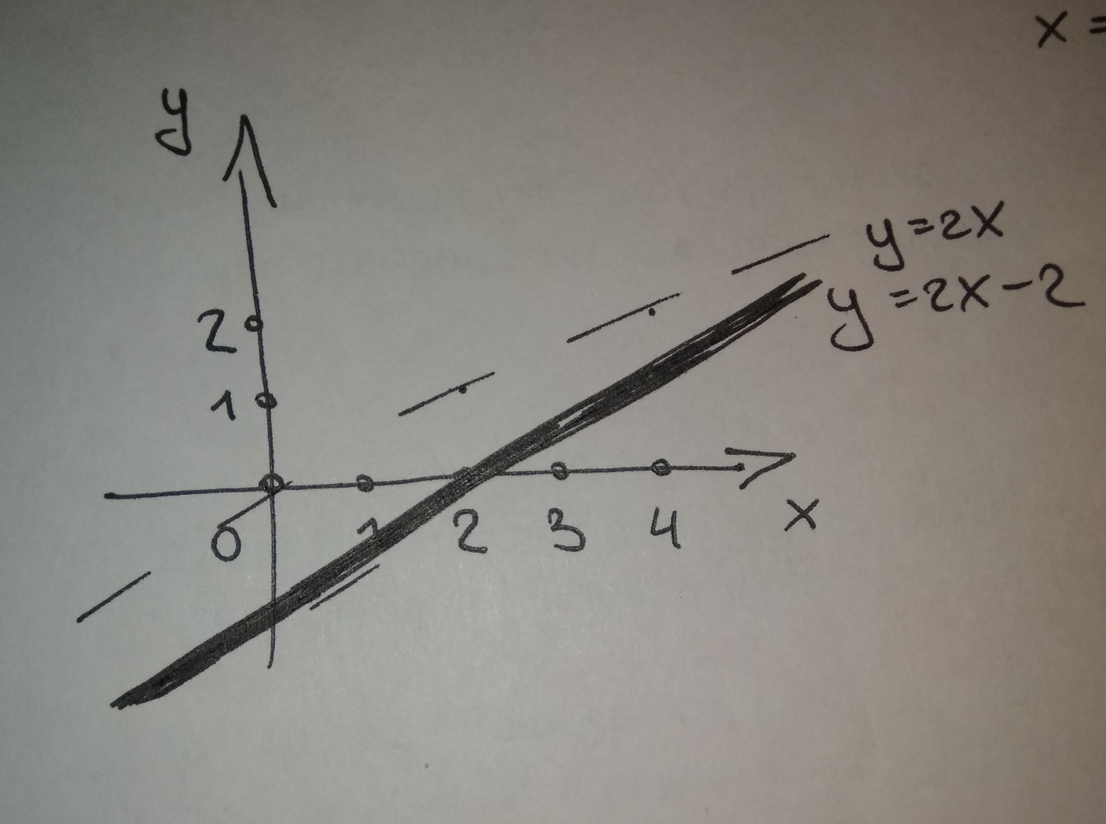 вот, от руки рисовала. подбираем точки для первого пунктирного графика чтоб y был равен 2х. (2;1), (4;2). затем -2 означает что график сдвинули вправо на две клеточки. следовательно двигаем все ключевые точки на две вправо