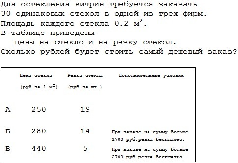 На первый взгляд, самый дешевый заказ можно сделать в фирме А, где стекло с резкой стоит дешевле, чем в фирме Б и в фирме В. Сумма же заказа недостаточна для того, чтобы приобрести стекло в фирмах Б и В по льготной цене (с бесплатной нарезкой).