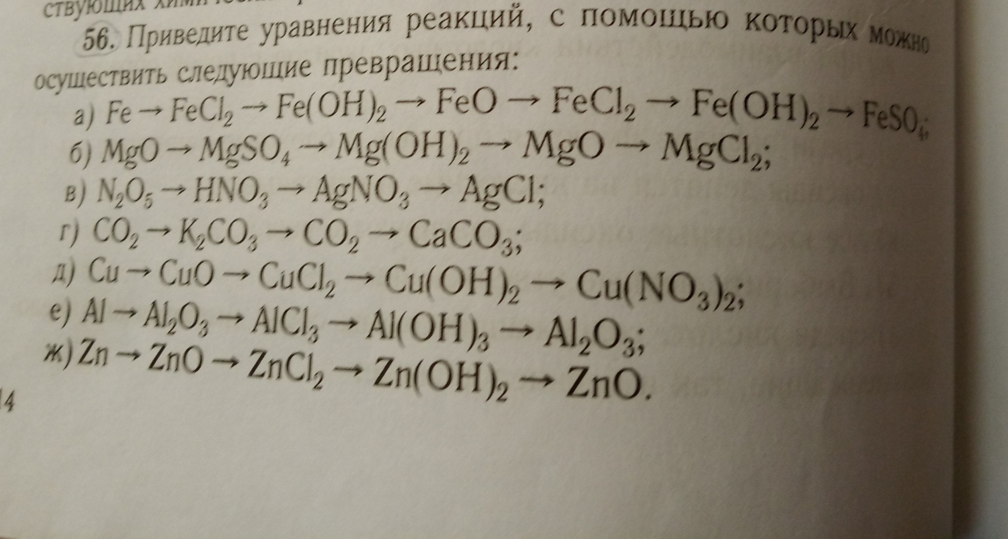 ж.) Zn = ZnO = ZnCl2 = Zn(OH)2 = ZnO