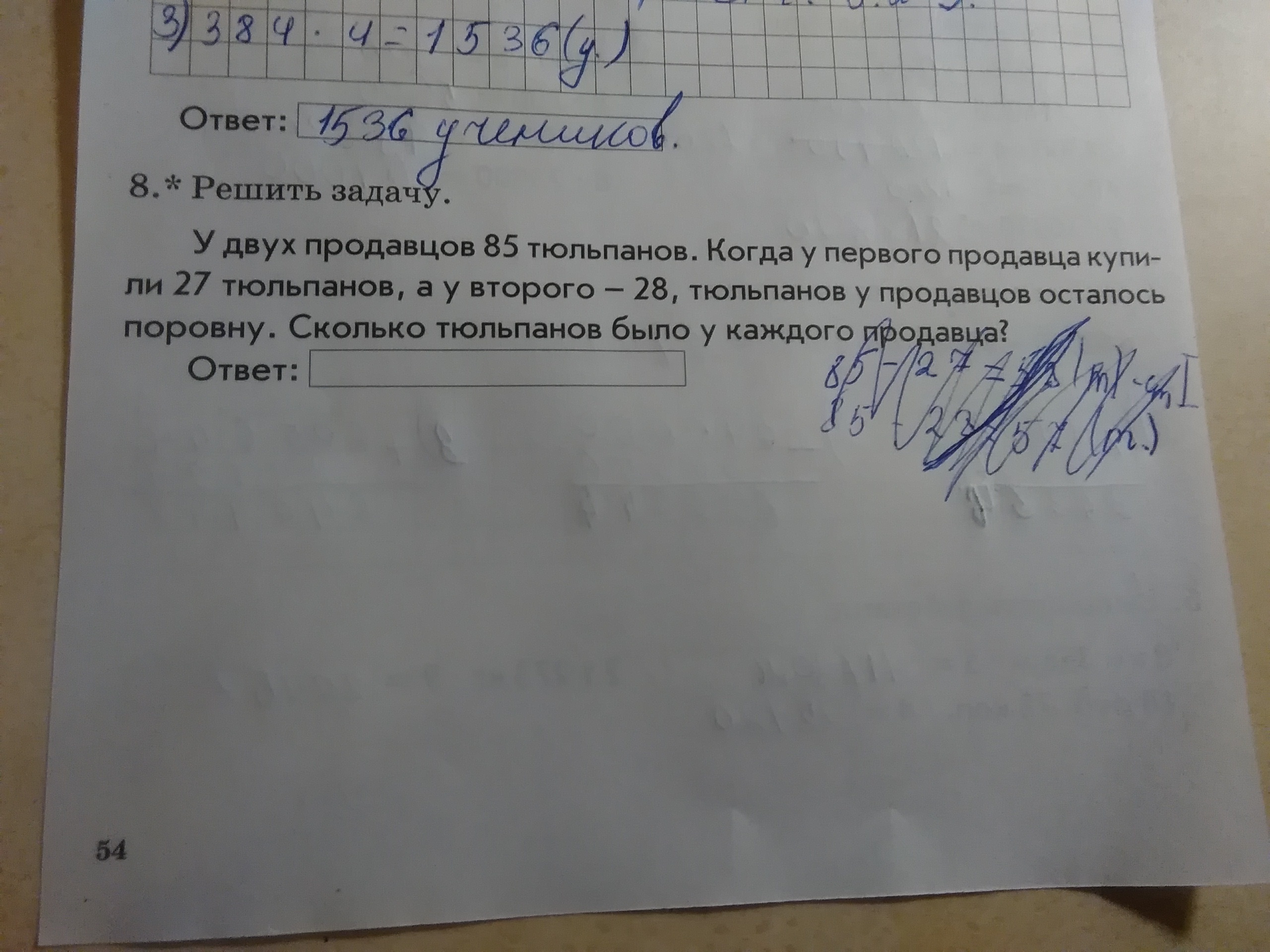 У двух продавцов 85 тюльпанов. Когда у первого купили 27 тюльпанов, а у второго-28, тюльпанов у продавцов осталось поровну. Сколько тюльпанов было у каждого продавца?