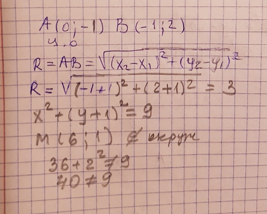 Даны точки А(0;-1),В(-1;2) . Запишите уравнение окружности с центром в точке А и радиусом АВ. Принадлежит ли этой окружности точка M (6;1)?