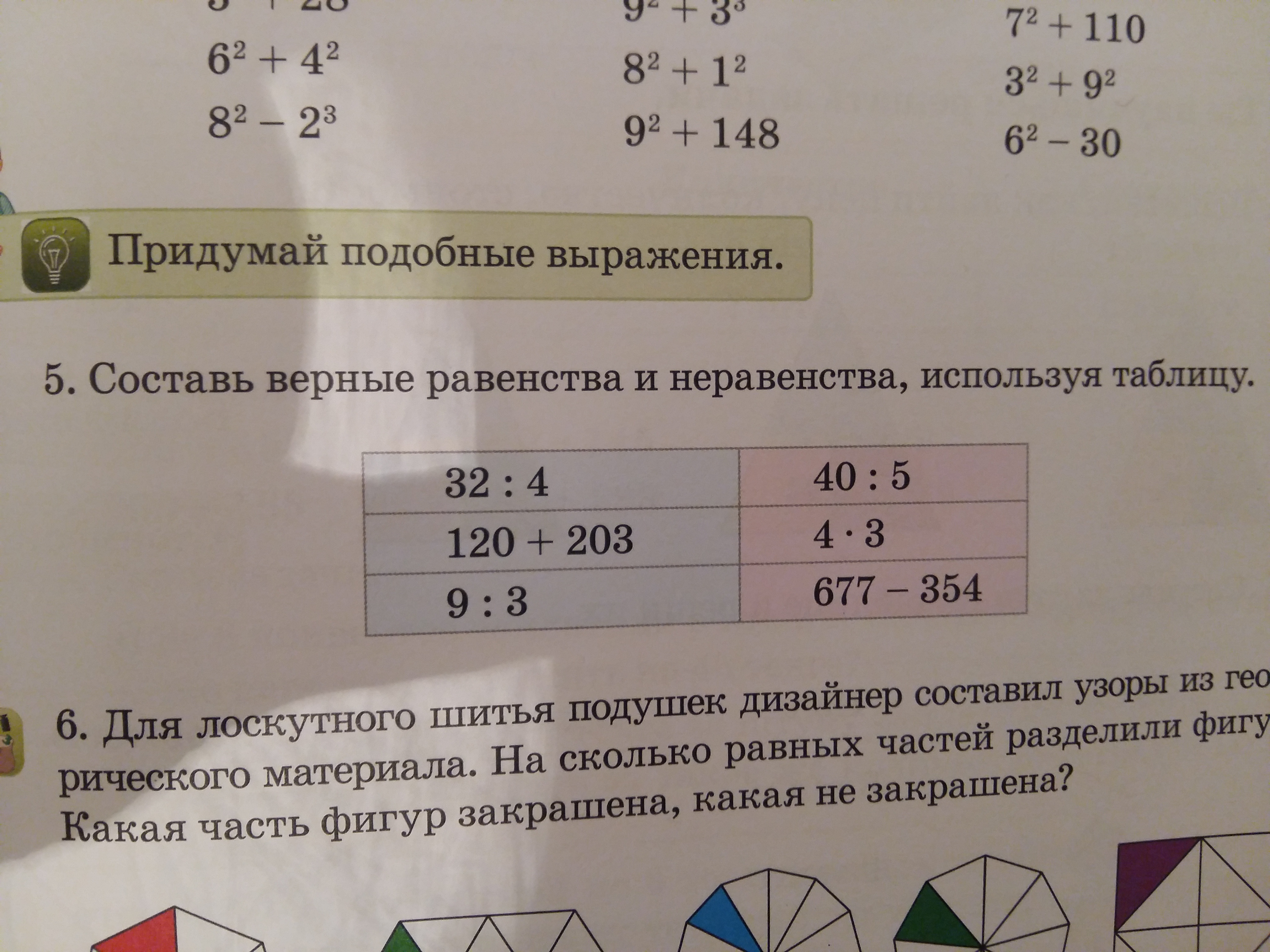 40:5=8 и 32:4=8, 120+203=323 и 677-354=323, 9:3=3 и 4*3=12 не равентство