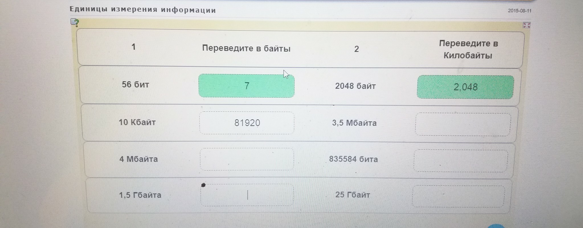 1 столбик 4 мб- 4000000 байта, 1,5 гб-1500000000 байта 2 столбик 3,5мг- 1024 кбайт, 835584 бит- 104,408 кбайт, 25гб- 25000000