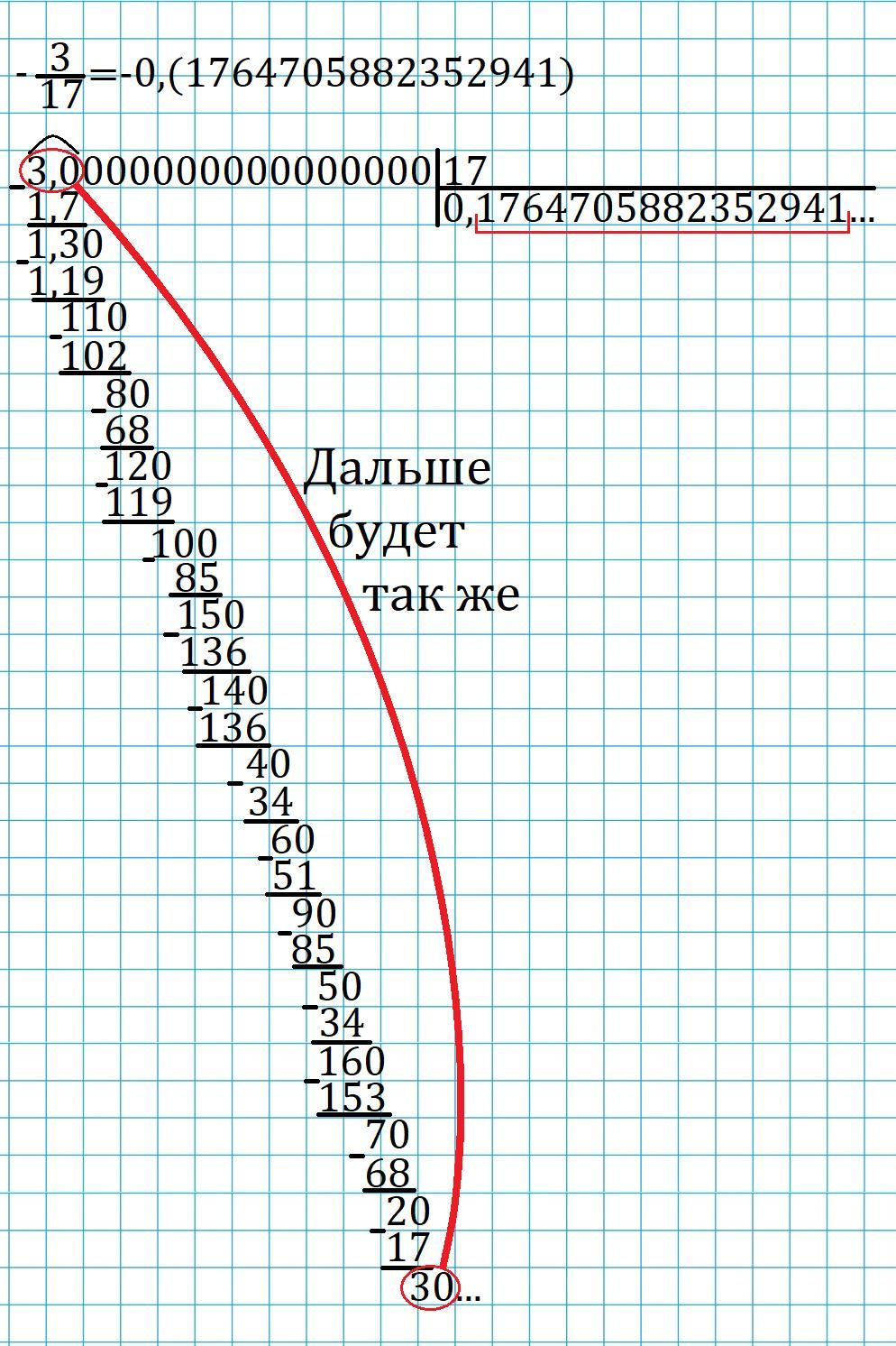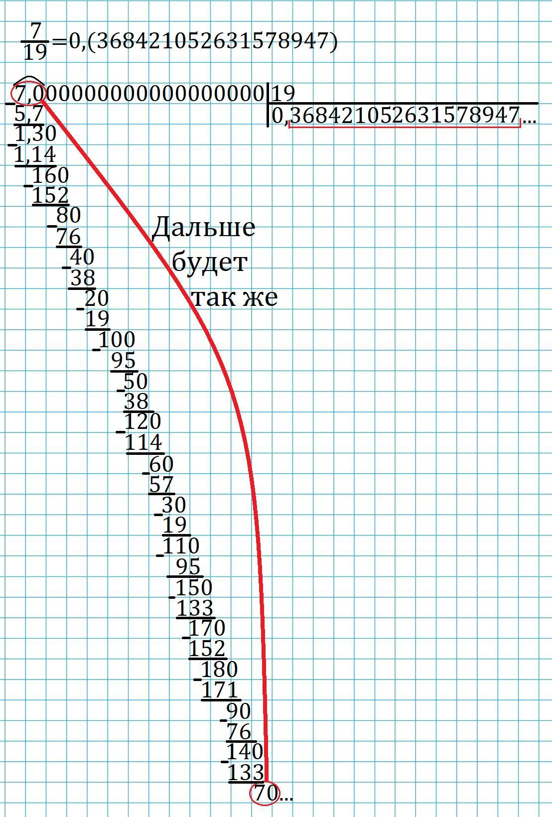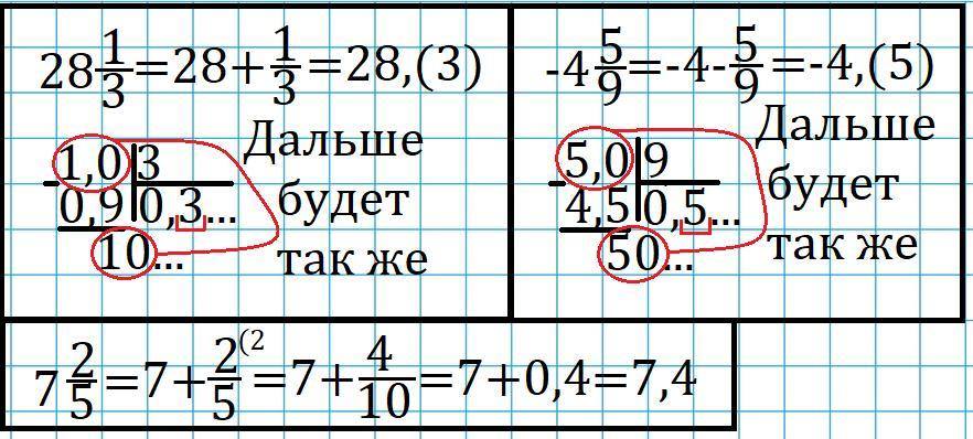 Представьте в виде бесконечной десятичной дроби число: 7/19; -3/17; 28целых 1/3; -4целых 5/9; 7целых 2/5.