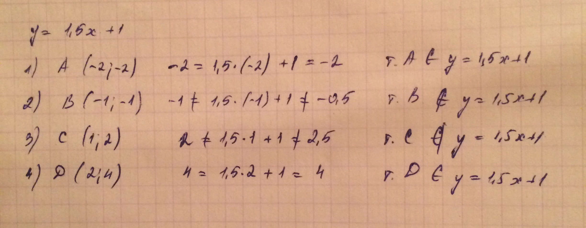 подставляем координаты точек в уравнение функции - если равенство не нарушается, значит точка принадлежит графику и наоборот.