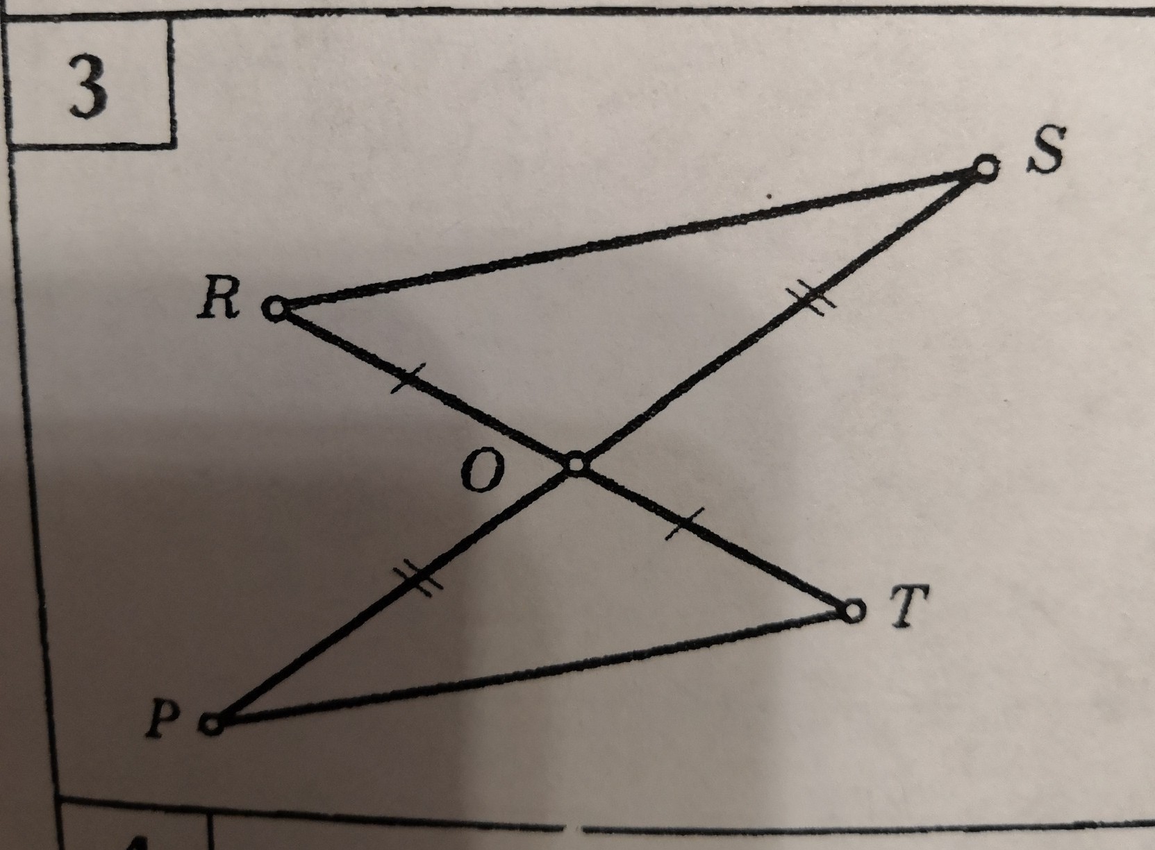 1. OR=OT (по условию), OP=OS (по условию), <ROS=<POT (по свойству вертикальных углов), =>∆ROS=∆POT (по двум сторонам и углу между ними). ч. т. д.
