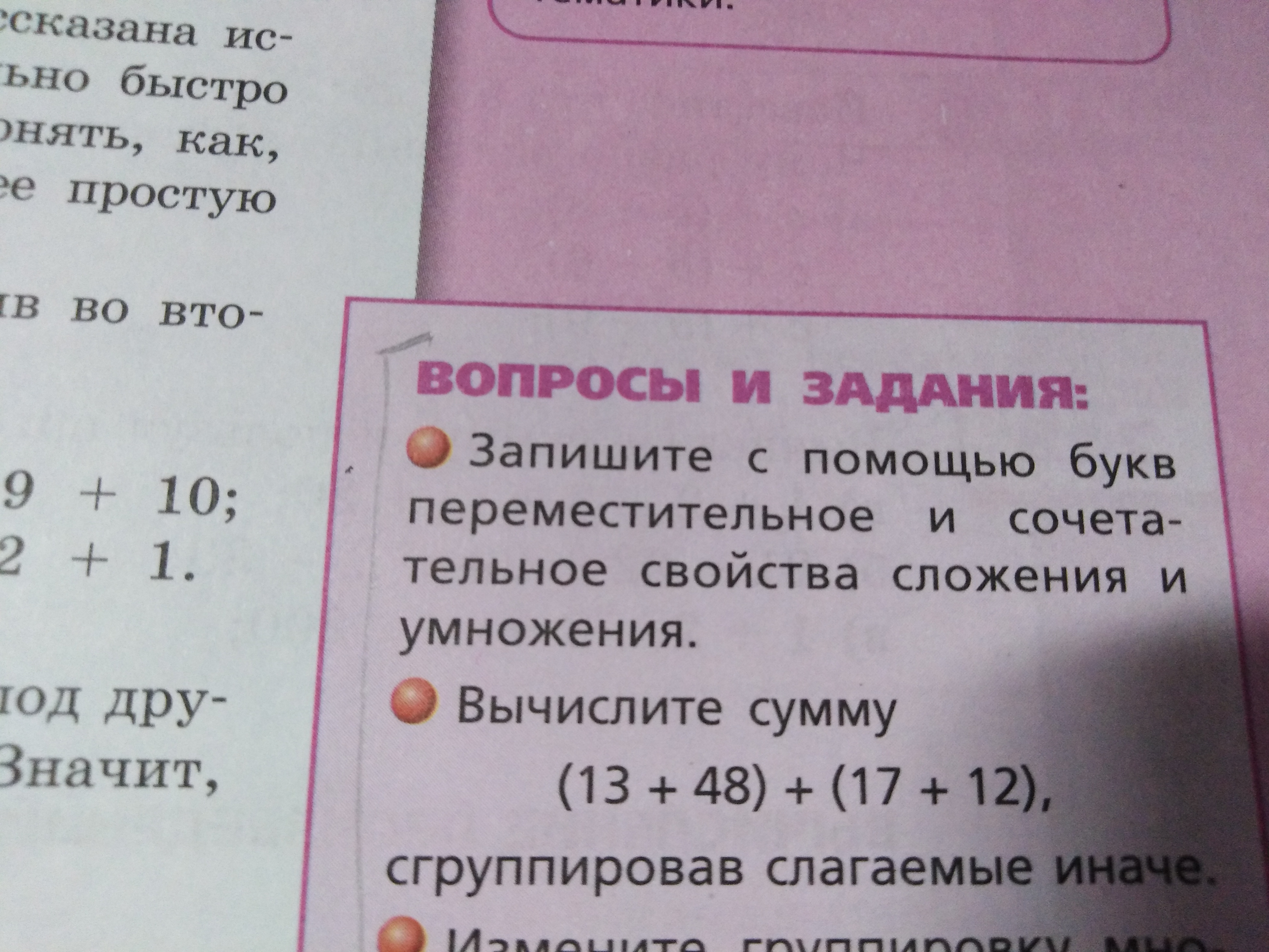 Запишите с помощью букв переместительное и сочетательное свойства сложения и умножения.