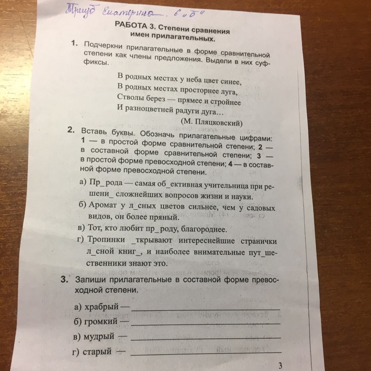 1)Синее, просторнее, прямее и стройнее везде суффикс - ее, разноцветней - суффикс - ей. Все эти слова - сказуемые, подчёркиваются двумя чертами. 2) самая объективная (4) сложнейших-(3); сильнее - (1), более приятный (2);благороднее (1); интереснейшие (3) ; наиболее внимательные (4). ПрИрода, обЪективная, при решениИ(сущ. на - ие предож. п) , лЕсных, прИроду, Открывают, лЕсной книгИ(1слонение род. п. ), путЕшественники. 3) самый храбрый наиболее громкий. самый мудрый, самый старший