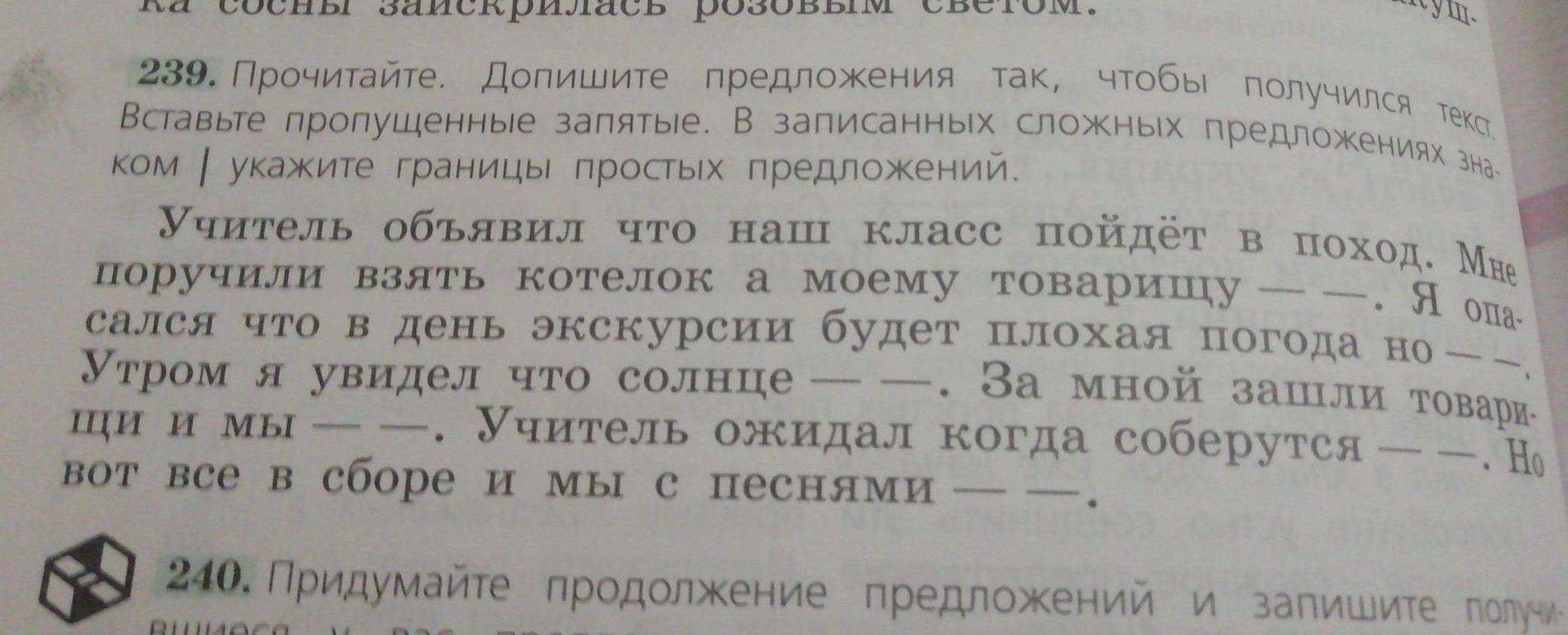 Учитель объявил, / что наш класс пойдет в поход. Мне поручили взять котелок, а моему товарищу веревку . Я опасался, / что в день экскурсии будет плохая погода, / но мои опасения были ложными . Утром я увидел, / что солнце озаряет теплыми лучами весь мой город . За мной зашли товарищи, / и мы вышли из дома . Учитель ожидал, / когда соберутся все мои одноклассники . Но вот все в сборе, / и мы с песнями радостно отправились в поход .