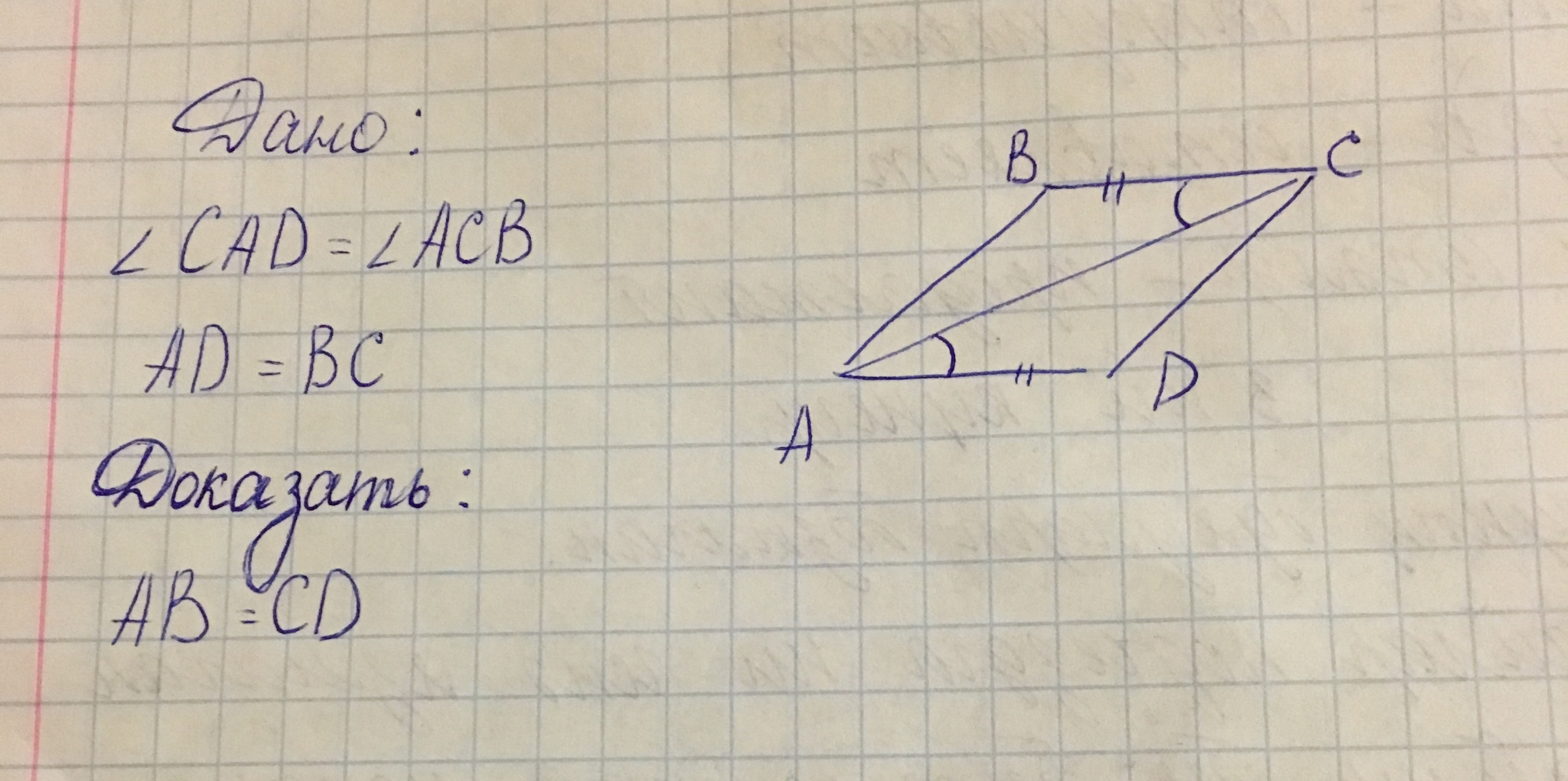 Рассмотрим тр-к авс и адс ад=вс по усл . ,ас- общая, <cад=< асв треуг-ки равны по двум сторонам и углу между ними, а значит ав=сд