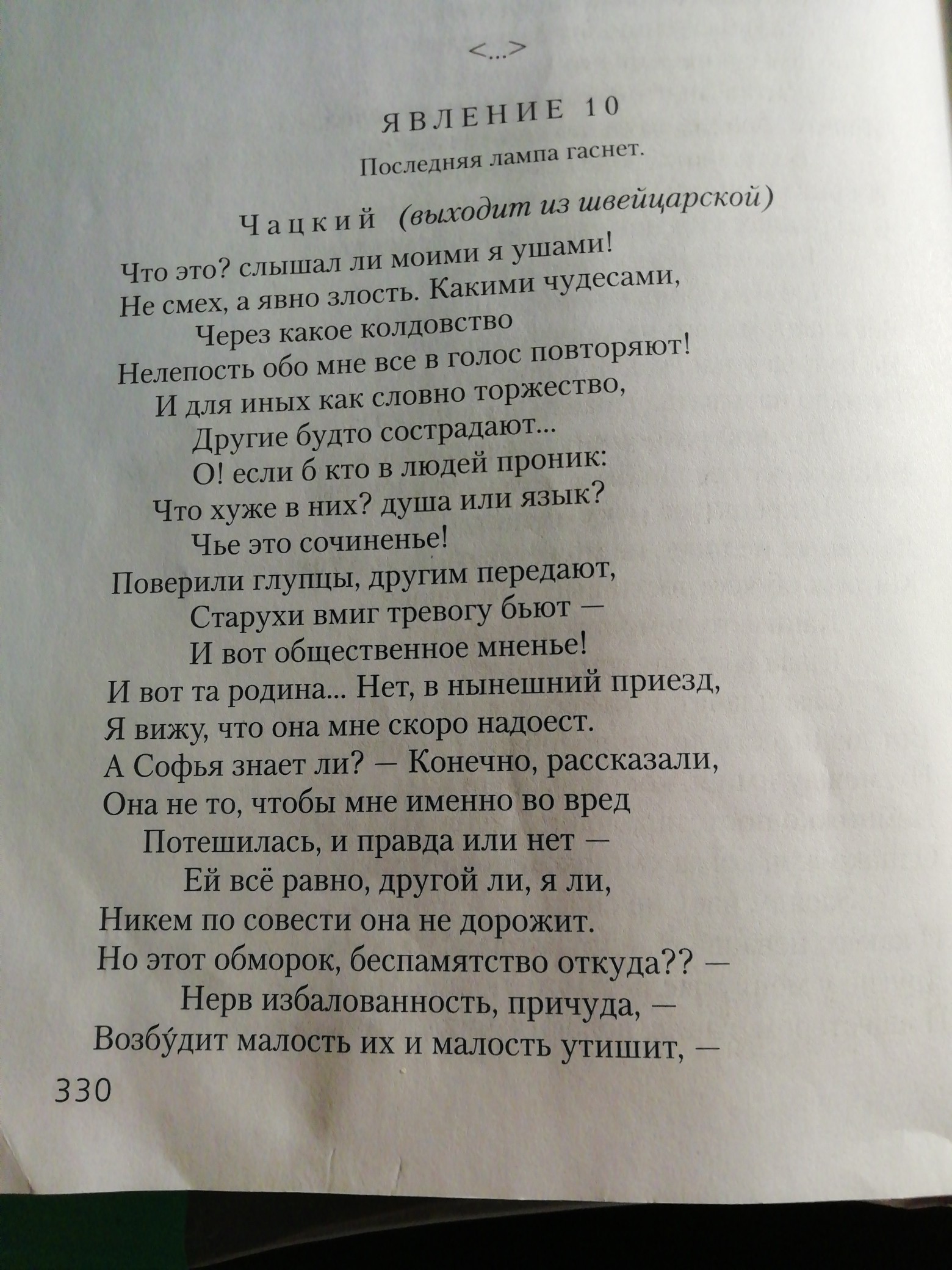Здесь поднимается тема зависимости от общественного мнения, праздности, стадности и глупости в обществе. Беззаботная толпа на балу рядит Чацкого в сумасшедшие благодаря злой шутке Софьи: никто не хочет признаться в том, что не первый узнал об этой новости. Внезапно богатые и заслуженные личности напоминают стадо баранов. Люди верят авторитетам безоговорочно: «если знают князья, значит, правда!» И ведут себя со стадной жестокостью, по большей части с безразличием к судьбе Чацкого: все дружно боятся его, опасаются заговорить: «Вдруг кинется!»