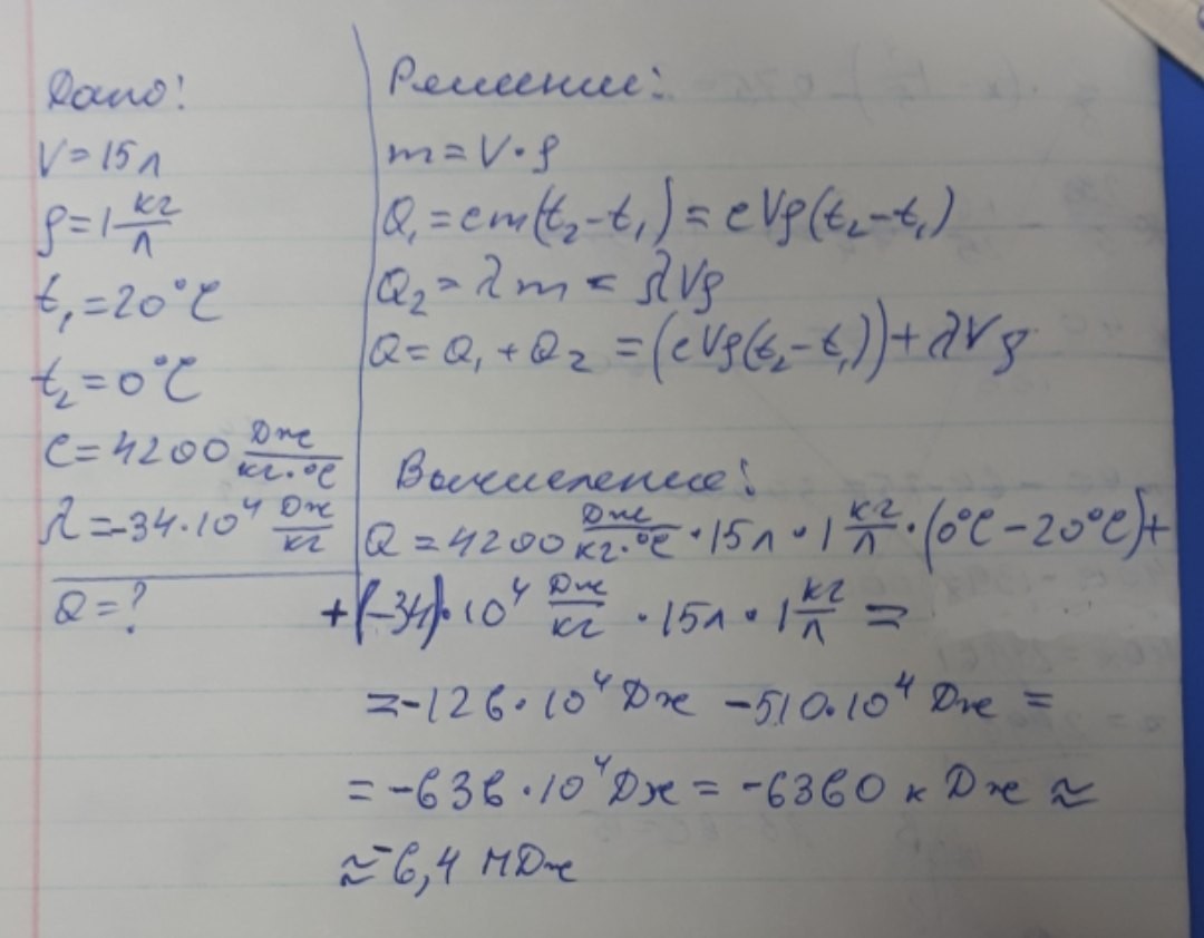 Какое кол-во теплоты отдает вода объёмом 15 л, взятая при температуре 20 *C, при кристаллизации при температуре 0 *C ? Начертите примерный график охлаждения и кристаллизации воды.