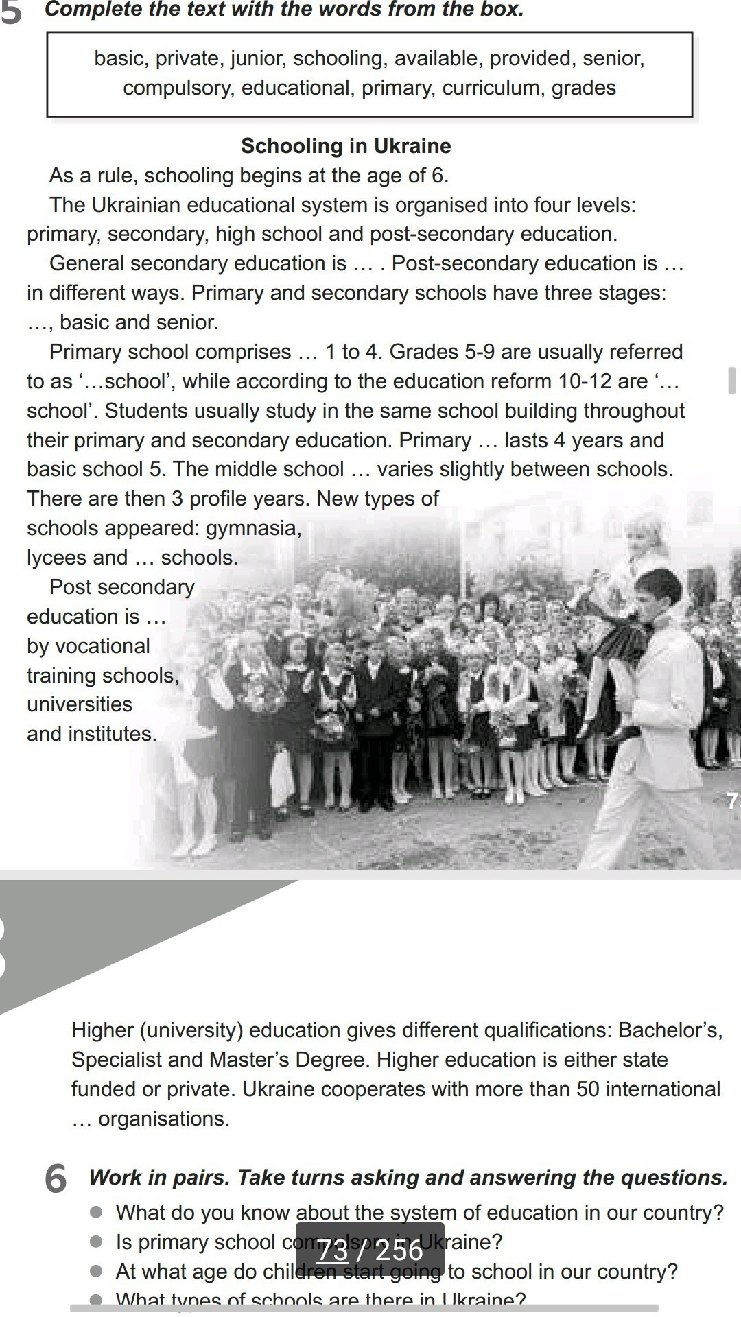 Навчання в Україні Українська система освіти складається з чотирьох рівнів: загальна середня освіта .... Післядипломна освіта - це, як правило, початок навчання у віці 6 років. Початкова, середня, середня школа та післядипломна освіта. по-різному. Початкові та середні школи складають три етапи: базові та старші. Початкова школа складається з .. 1-4. 5-9 класи зазвичай називають ... школою, тоді як відповідно до реформи освіти 10-12 школярів. Студенти, як правило, навчаються в одній і тій же школі під час початкової та середньої освіти. Початкова школа триває 4 роки, а основна школа 5. Середня школа. трохи змінюється між школами. Існує 3 роки профілю. Виникли нові види шкіл: гімназія, ліцеї та ... школи. Постнова середня освіта здійснюється за рахунок професійно-технічних навчальних закладів, університетів та інститутів