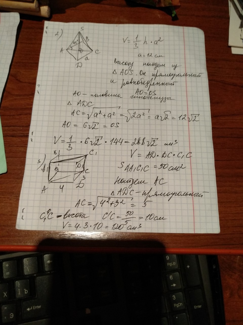 2)в правильной четырёхугольной пирамиде боковые грани наклонены к плоскости основания под углом 45 градусов. Ребро основания 12 см. найти объём пирамиды.