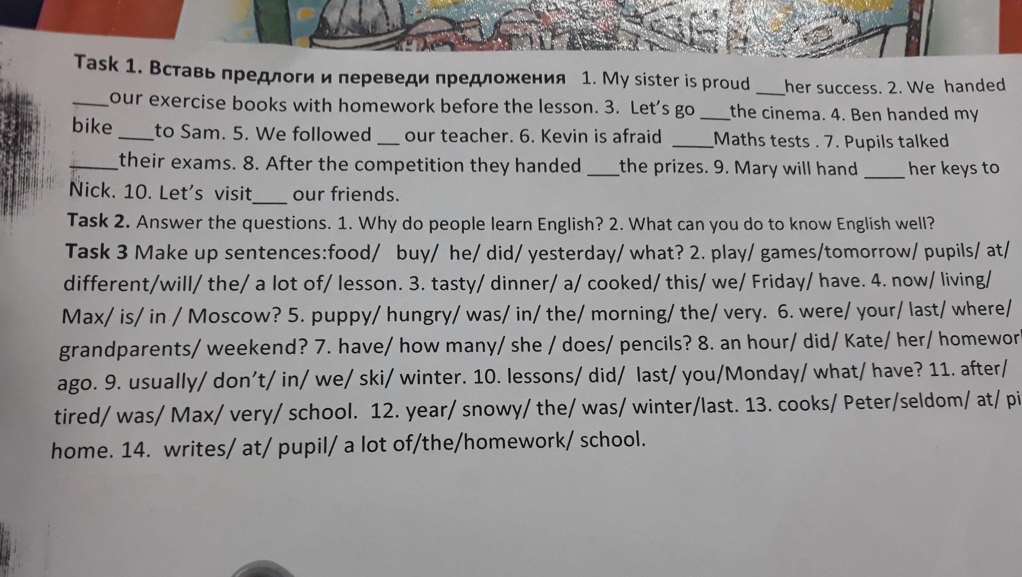 3.1) what food did he buy yesterday?2)pupils will play a lot of different games at lesson tomorrow. 3)this friday we have cooked a tasty dinner. 4)is max living in Moscow now? 5)the puppy was very hungry in the morning. 6)where were your grandparents last weekend? 7)how many pencils does she have ?8)kate did her homework an hour ago. 9)we usually don’t ski in winter. 10)what did you have lessons last monday? 1)max was very tired after school. 12)last year the was snowy. 13) хз14)pupil writes a lot of homework at the school.