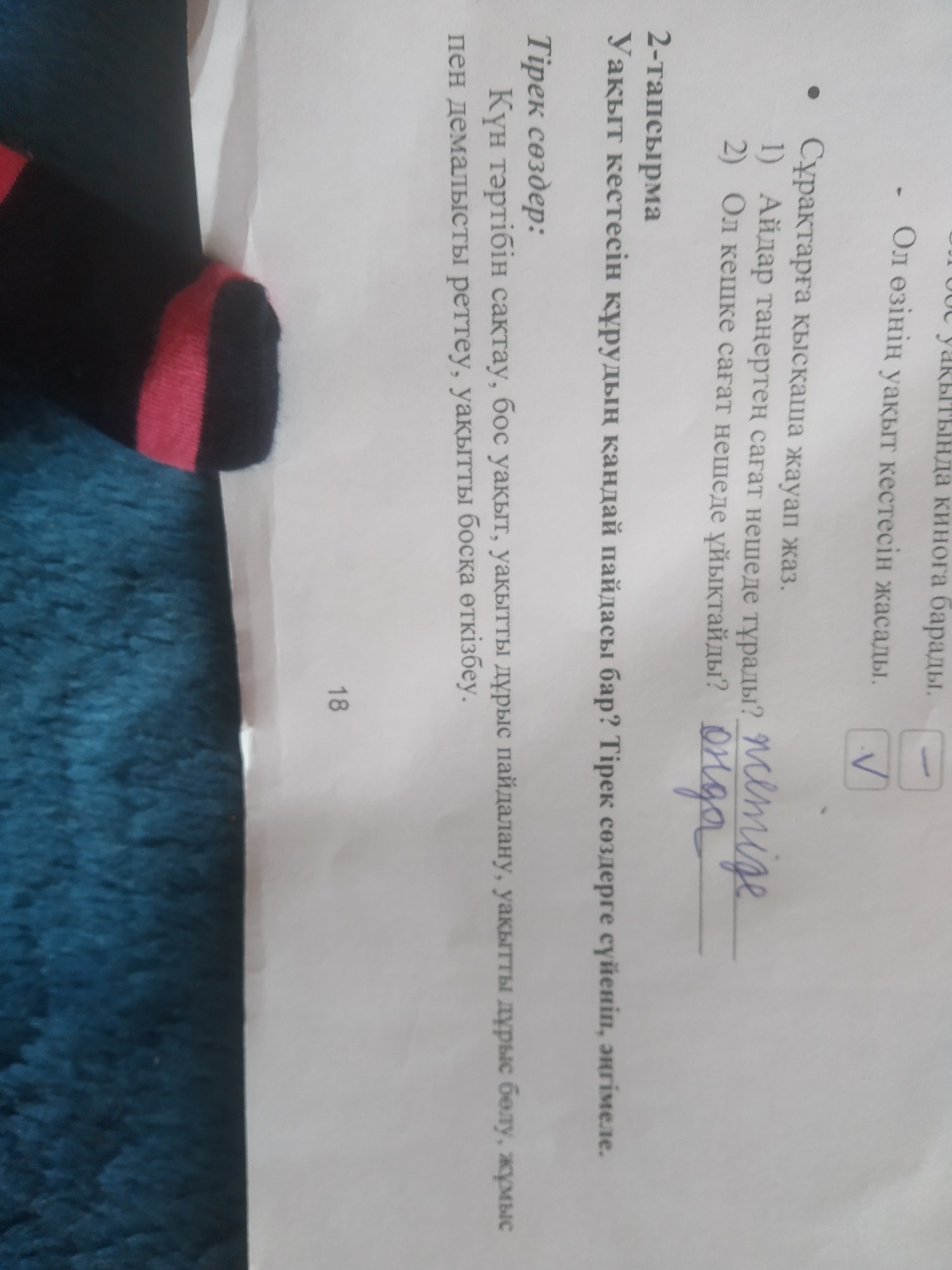 Мысалға уақытты дұрыс пайдалану арқылы өзіміздің сүйікті ісімізге бос уақыт табамыз және де уақтты дұрыс жұмсап үйренеміз. Жұмыс пен демалысқа да арнайды уақыт бөлген жөн. Сіздерге де уақытты босқа өткізбеуге кеңес беремін. Бос уақытыңызда жақындарыңызбен көбірек көңіл көтеріп отырған жақсы.