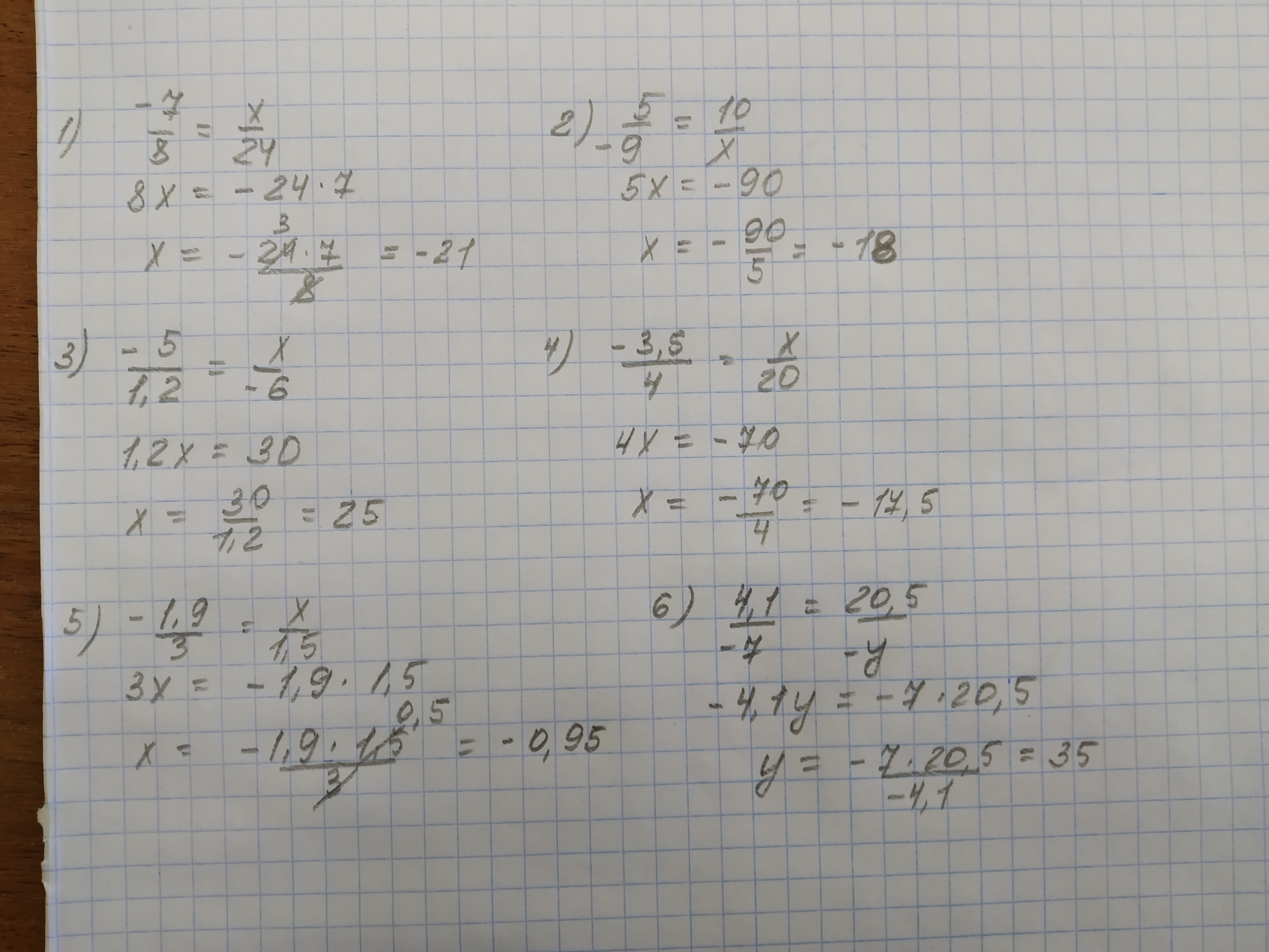 5 х=-1,9*15/3=-9,5 6. -у=-7*20,5/4,1=-35, у=35