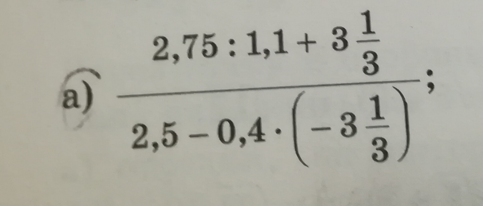 2,75:1,1=2,5 2,5+3 1/3=5 5/6 2,5-0,4=2,1 2,1•(-3 1/3)=7 7:5 5/6=6/5