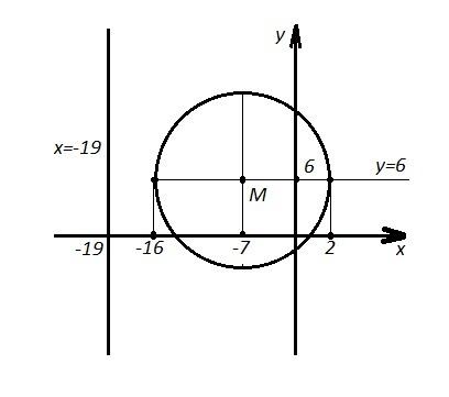 Так как центр окружности (х+7)²+(у-6)²=81 находится в точке М(-7,6), а радиус окружности R=9, то от центра М самая дальняя точка окружности , лежащая на прямой у=6, находится на расстоянии , равном 9, и её абсцисса будет равна (-7-9)= -16. Поэтому прямая х+19=0, то есть х= -19 , не будет пересекать окружность. Значит общих точек у прямой и окружности нет.