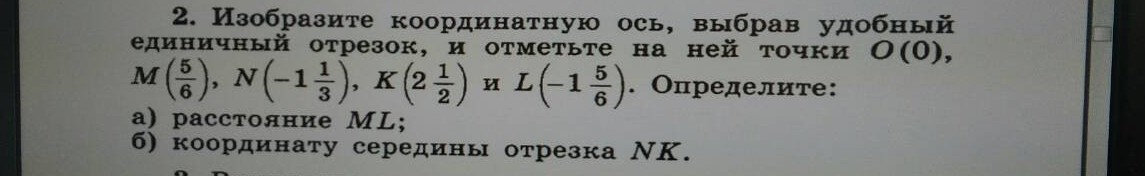 расстояние МL = 5/6 - (- 1 5/6) = 5/6 + 1 5/6 = 1 10/6 = 2 4/6 = 2 2/3,