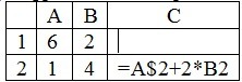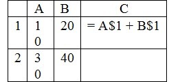 Чему станет равным значение ячейки С2, если в неё скопировать формулу из ячейки С1. (Знак $ обозначает абсолютную адресацию).
