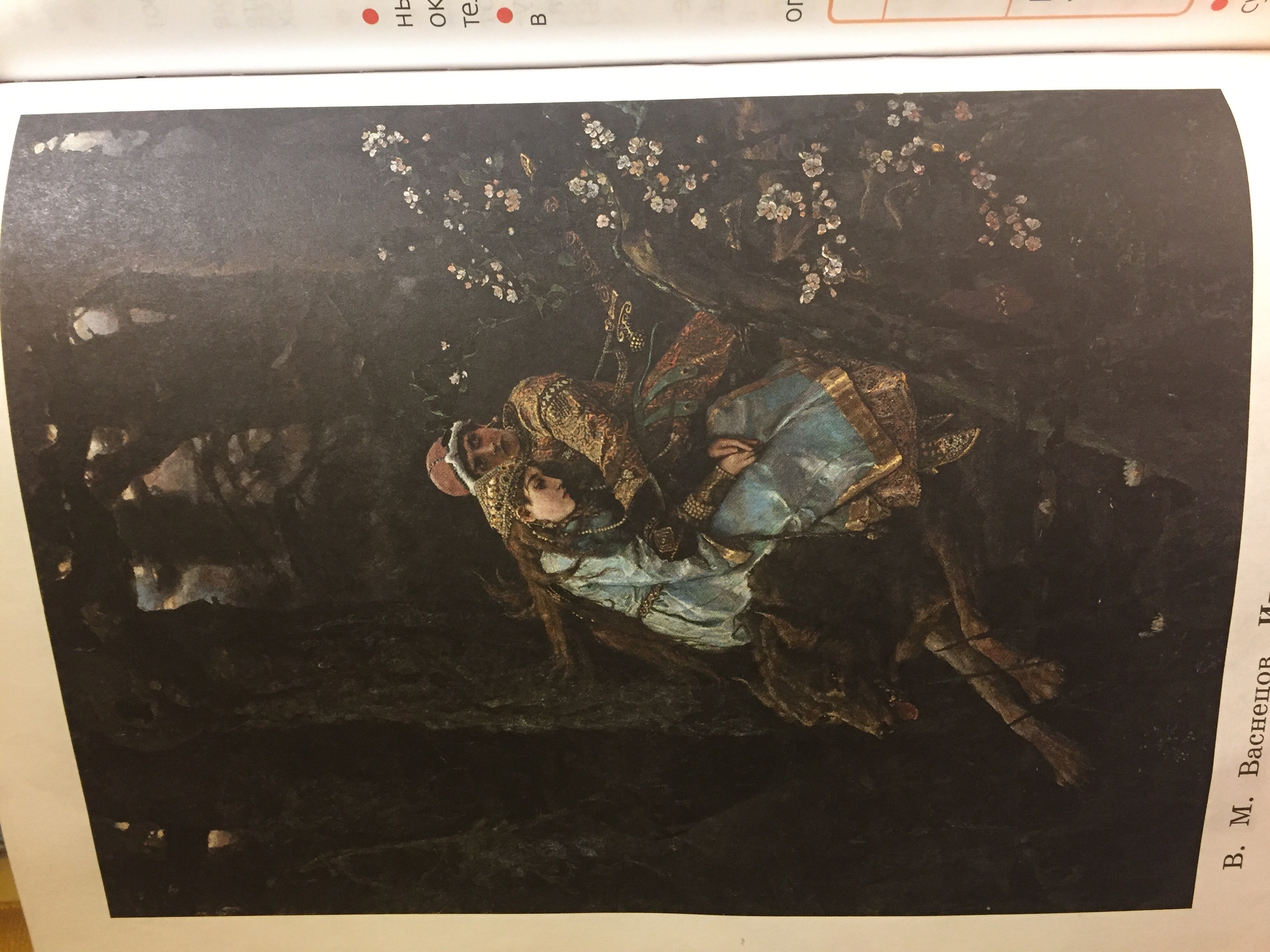Картина «Иван-царевич на Сером Волке» была написана В. М. Васнецовым в 1889 году по сюжету известной русской народной сказки, строчки из которой невольно вспоминаются при просмотре картины: «Помчался серый волк с Иваном — царевичем, с Еленой Прекрасной обратной дорогой — синие леса мимо глаз пропускает, реки, озера хвостом заметает… » Глядя на картину, зритель словно погружается в волшебный мир, оказавшись рядом с главными героями сказки: Иваном-царевичем и Еленой Прекрасной, которые скачут на Сером Волке подальше от владений злого царя. Сидя на своём верном друге, Иван-царевич крепко и бережно обнимает Елену Прекрасную. На нём красивый кафтан из дорогой парчи, подпоясанный зелёным кушаком, чёрные перчатки с узором, красная шапочка на голове и красивые красные сапоги. У Ивана-царевича серьёзное выражение лица. Его большие глаза тревожно всматриваются вдаль: нет ли за ними погони? Не отнимет ли злодей его счастье? За спиной у главного героя виднеется меч: добрый молодец всегда готов встать на защиту. Рядом с ним сидит Василиса Прекрасная — русская красавица с длинными вьющимися русыми волосами, которые развеваются на ветру. Она одета в красивое светло-голубое шёлковое платье с золотой отделкой рукавов и нижней части одежды. Шею красавицы украшают жемчужные бусы. На ногах у неё красивые сафьяновые сапожки. Её голову покрывает красивая шапочка, украшенная драгоценными камнями. Девушка положила голову на грудь своего спасителя, у неё задумчивый взгляд. Царевна отдала свою судьбу в руки Ивана-царевича и смиренно сложила руки перед собой. Образ Василисы Прекрасной был написан художником со своей племянницы — Натальи Анатольевны Мамонтовой. Серый Волк изображён в движении. Он несётся что есть духу, чтобы его не догнали. Уши сказочного персонажа прижаты к голове, язык выглядывает из огромной зубастой пасти, но глаза не выражают злобу. Сильные лапы оторвались от земли, чтобы сделать очередной длинный прыжок через болото. Герои сказки изображены на фоне пейзажа. Видно, что их путь проходит через старый лес. Вековые деревья обросли зелёным мхом, их кора полопалась и местами оторвалась. Лес мрачен и страшен, он символизирует злые силы, окружившие главных героев. Вокруг непроходимая чаща. Корявые тёмные ветви мешают беглецам. Красивые белые кувшинки, растущие на болоте и нежно-розовые цветы старой яблони с ярко-зелёными листочками, символизируют надежду на спасение и счастливый конец. Картина выполнена в контрастных тонах: тёмные краски леса являются символом злых сил, тревоги и опасности. Главные герои живописного произведения написаны яркими светлыми красками — это добрые, светлые силы. Борьба добра со злом непременно закончится победой первого, как традиционно завершаются все русские народные сказки. В. М. Васнецов в картине «Иван-царевич на Сером Волке» создал волшебный мир русской народной сказки. Перечитывая Ивана-царевича и серого волка, непременно вспоминается это произведение живописи, которое остаётся в памяти неразрывно связанное с русской народной сказкой. Здесь искали: сочинение по картине васнецова иван царевич на сером волке 4 класс сочинение по картине иван царевич на сером волке сочинение иван царевич на сером вооке